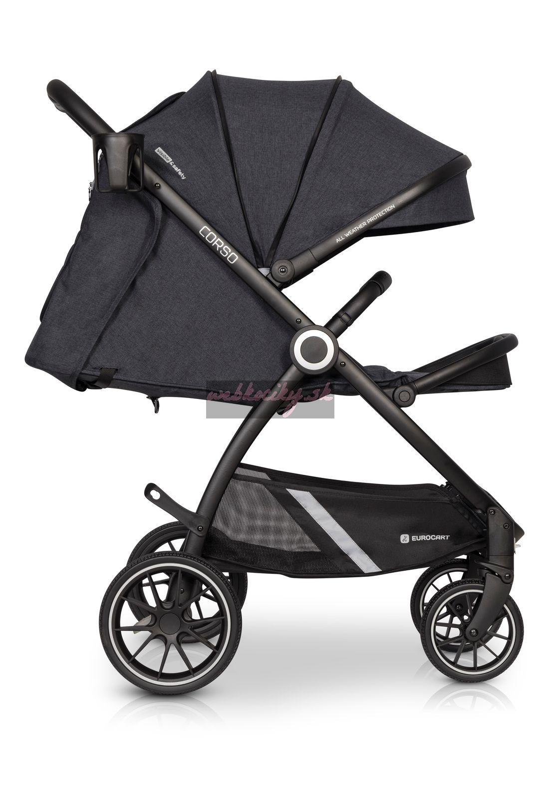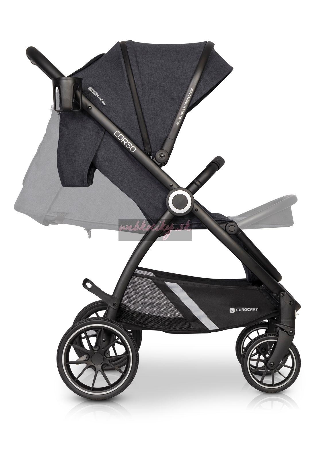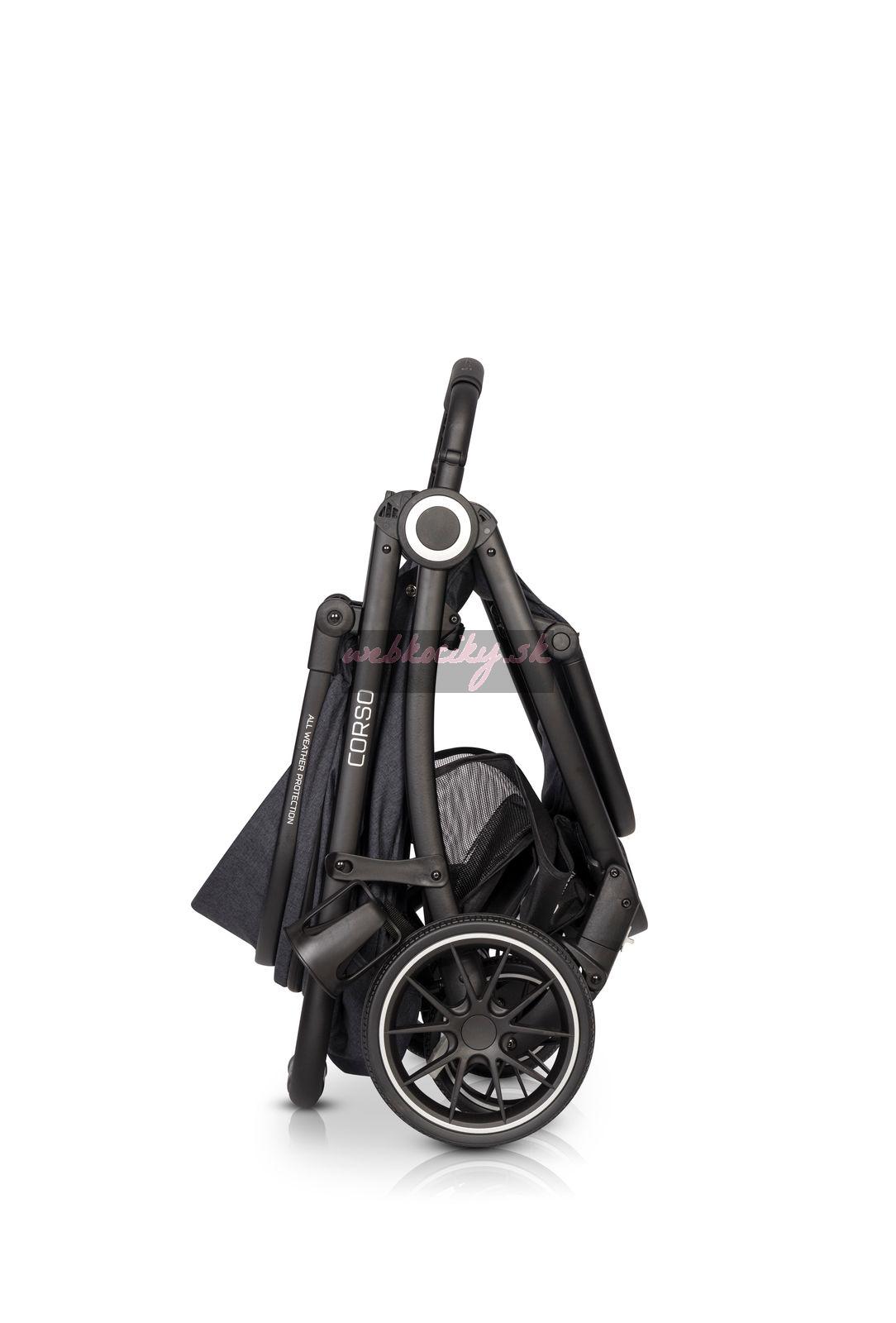 Euro-Cart Corso je veľmi kompaktný. V zloženom stave si vďaka ochrane nielen zachováva svoj tvar, ale stojí aj samostatne, čím chráni čalúnenie pred kontaktom s vozovkou. Po zložení slúži bezpečnostná madlo ako rukoväť, takže môžete svoje Corso nosiť ako kufor.