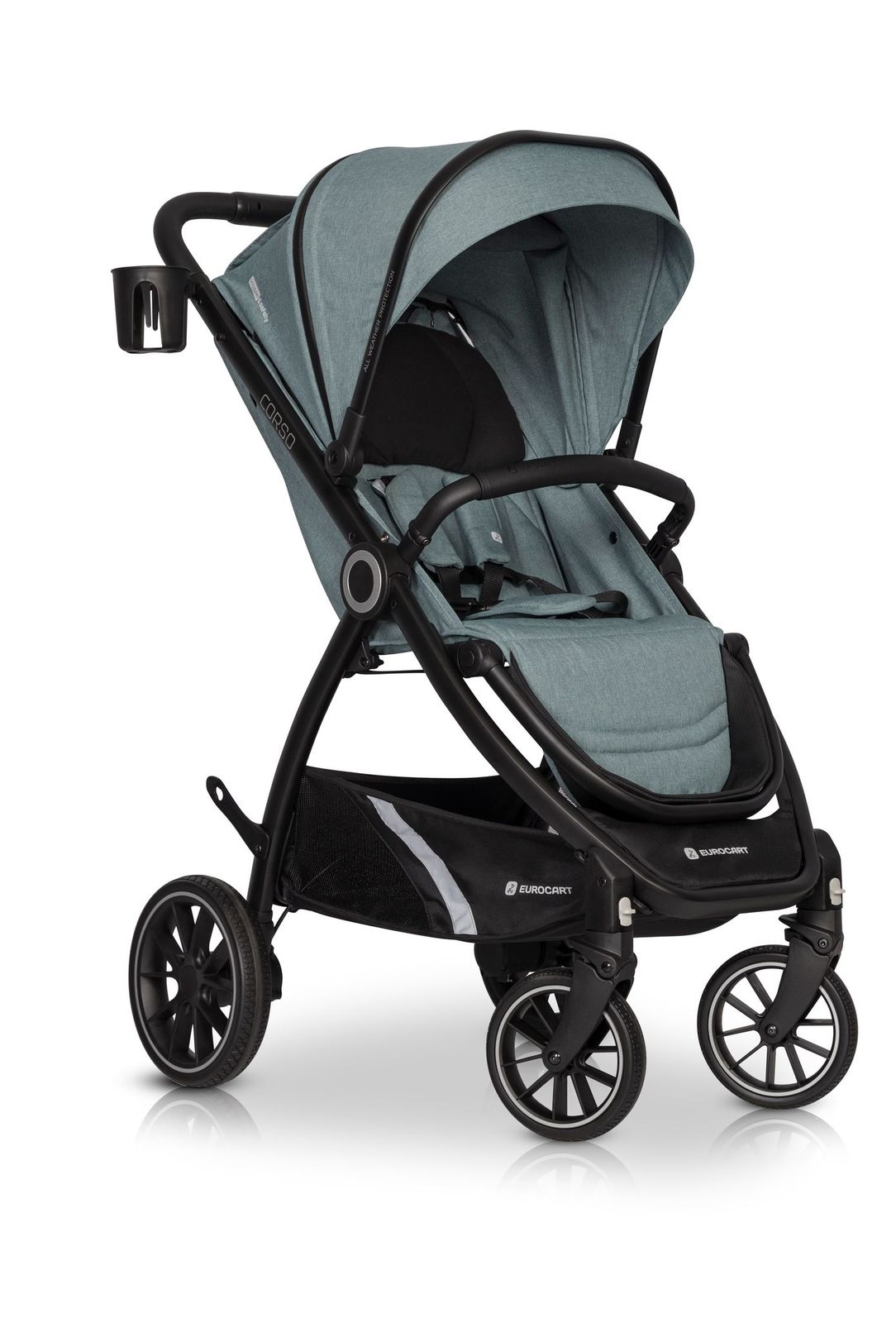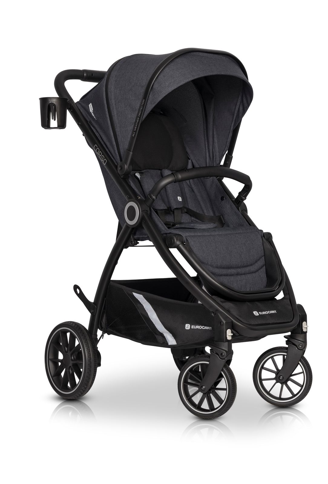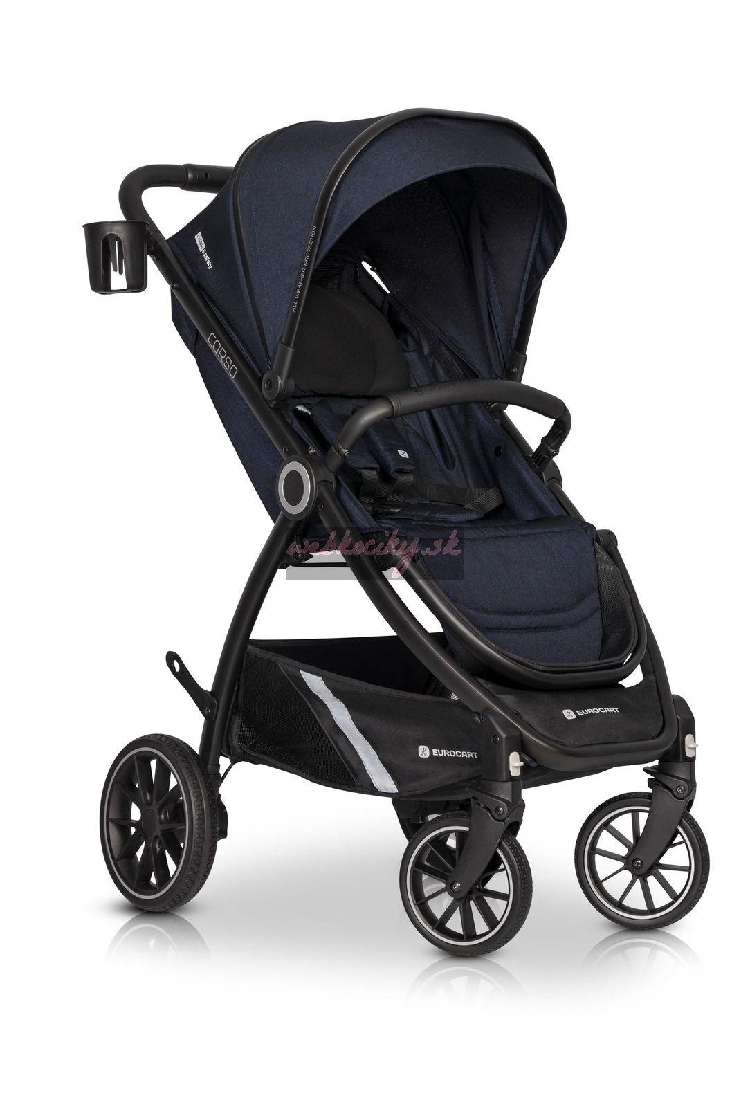 Euro-Cart Corso je veľmi kompaktný. V zloženom stave si vďaka ochrane nielen zachováva svoj tvar, ale stojí aj samostatne, čím chráni čalúnenie pred kontaktom s vozovkou. Po zložení slúži bezpečnostná madlo ako rukoväť, takže môžete svoje Corso nosiť ako kufor.