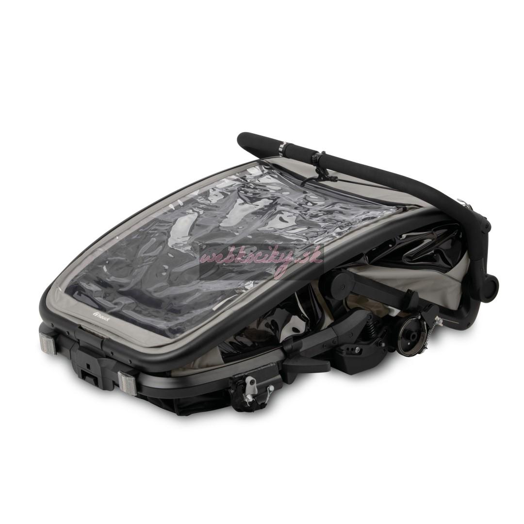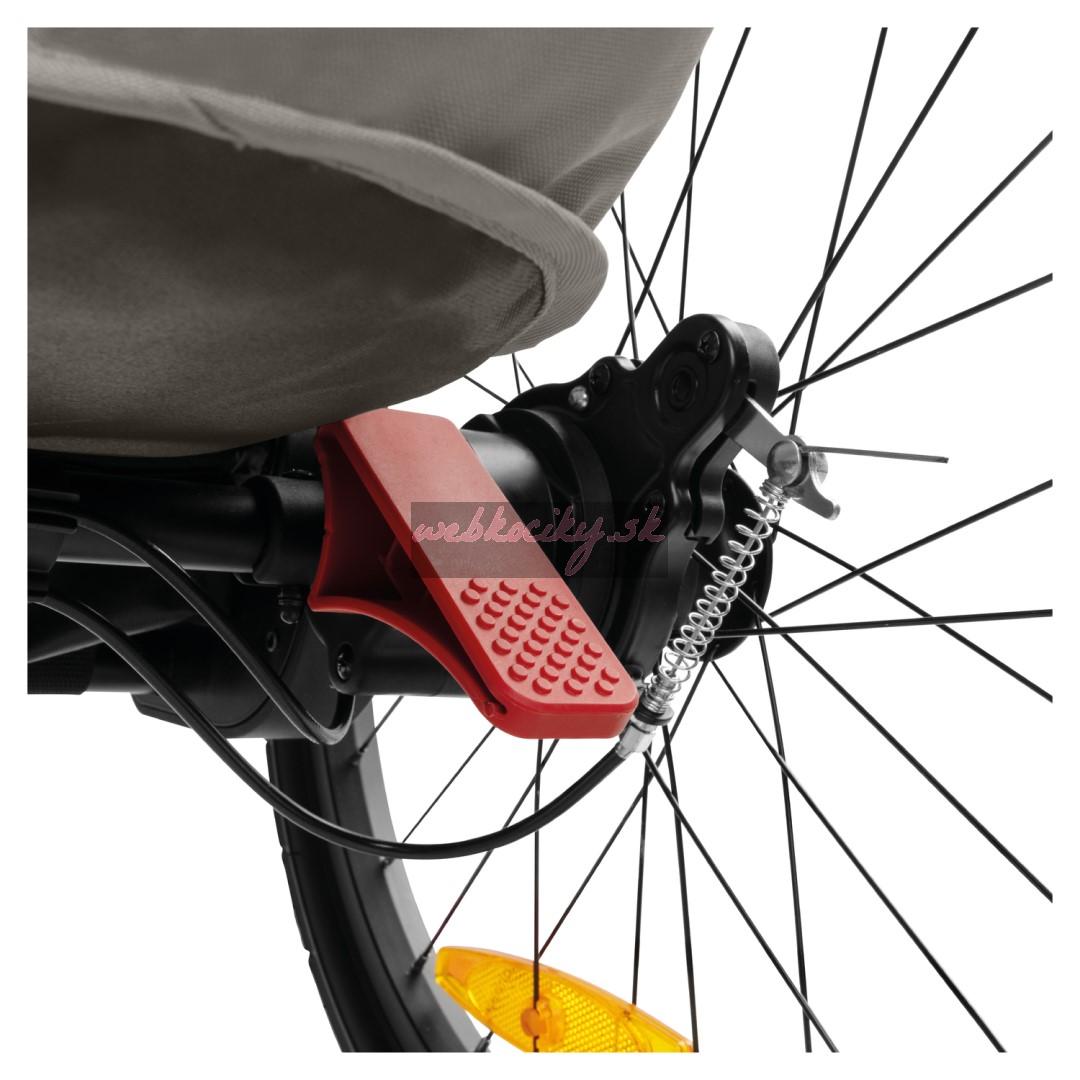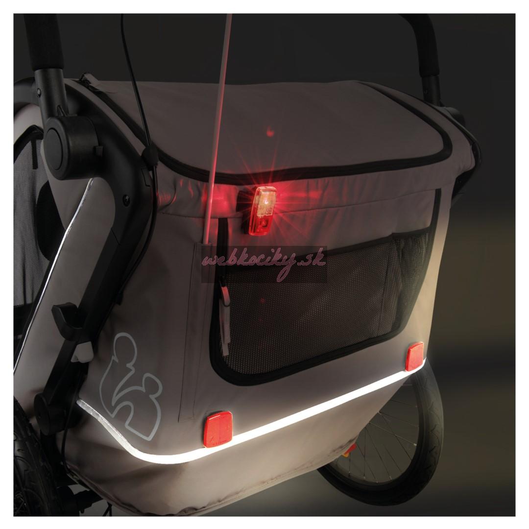 Dobrá ochrana - Cyklovozík má odnímateľné tónované bočné okná a striešku 3v1 ktorá poskytuje ochranu pred vetrom, slnkom a hmyzom – skladá sa z pláštenky, slnečnej clony s UV 50+ ochranou a sieťky, ktorá poskytuje dostatočný prísun vzduchu. V športovom režime máte nad vozíkom úplnú kontrolu vďaka ručnej brzde a bezpečnostnému remienku na ruku, pri bežnej jazde je možné tiež aplikovať nožnú brzdu.
