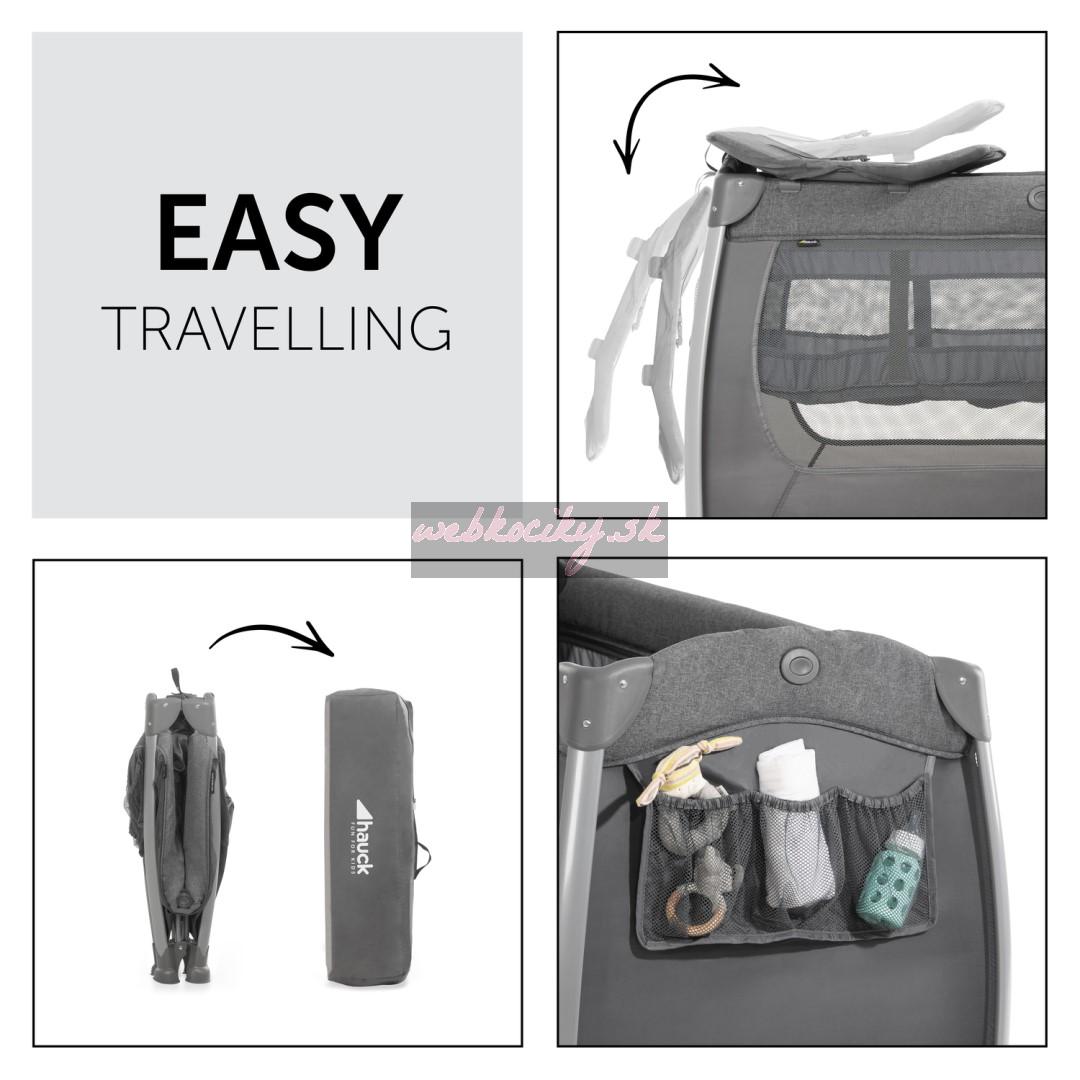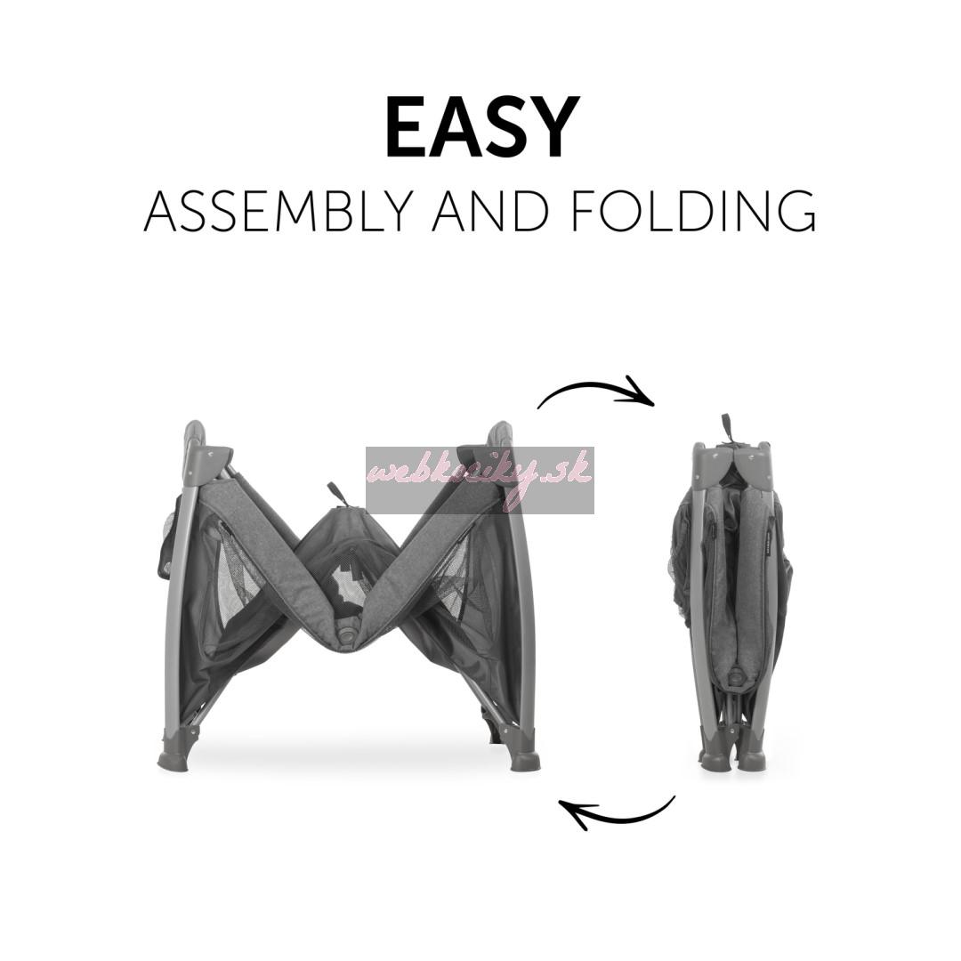 > Vďaka vonkajším tlačidlám na všetkých štyroch stranách je montáž a demontáž rýchla a jednoduchá, a to aj pre jednu osobu. Cestovnú postieľku s príslušenstvom je možné v zloženom stave uložiť do dodanej prepravnej tašky, a ušetriť tak miesto.