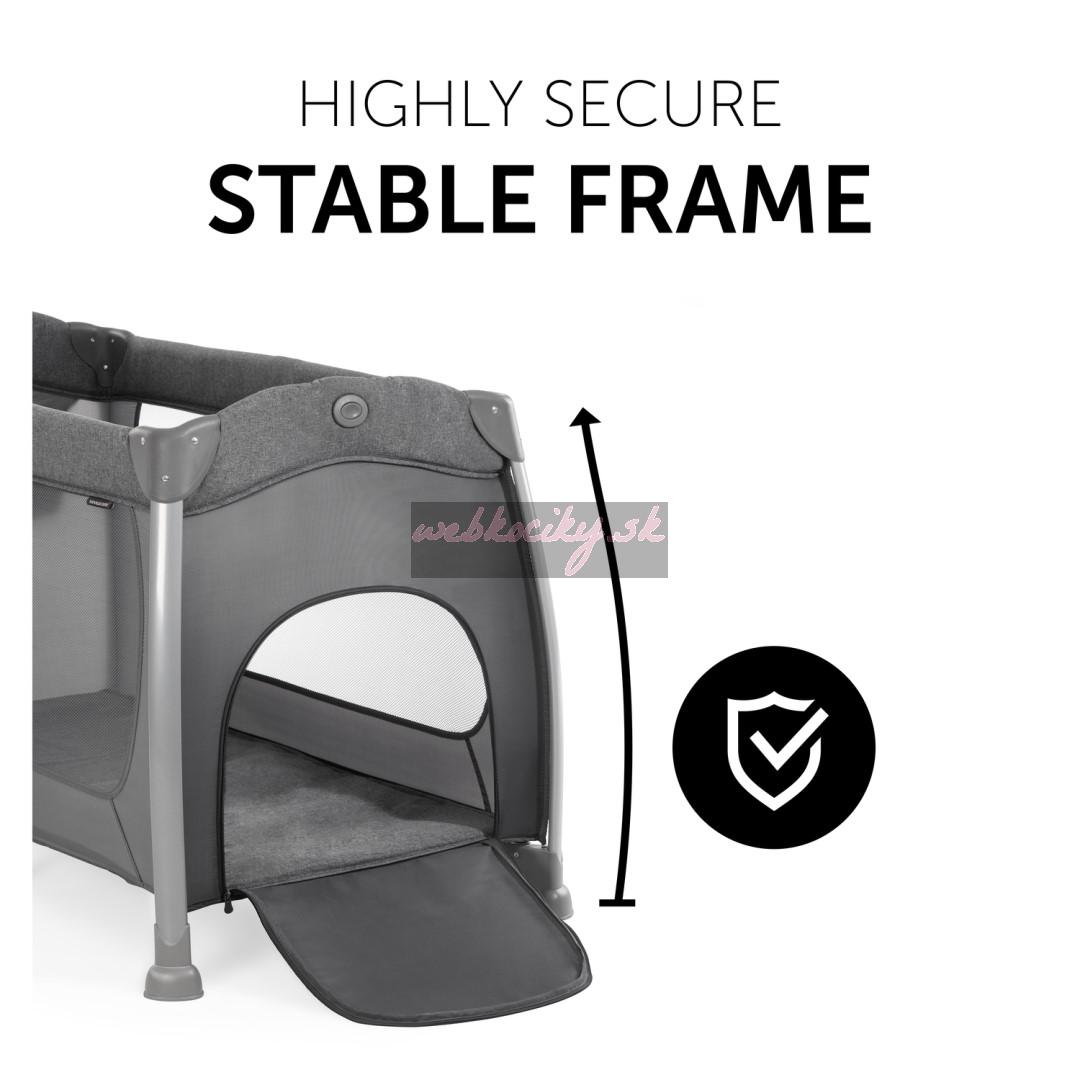 > ĽAHKÁ MONTÁŽ A DEMONTÁŽ // Vďaka vonkajším tlačidlám na všetkých štyroch stranách je montáž a demontáž rýchla a jednoduchá, a to aj pre jednu osobu. Cestovnú postieľku s príslušenstvom je možné v zloženom stave uložiť do prepravnej tašky (súčasťou), a ušetriť tak miesto.