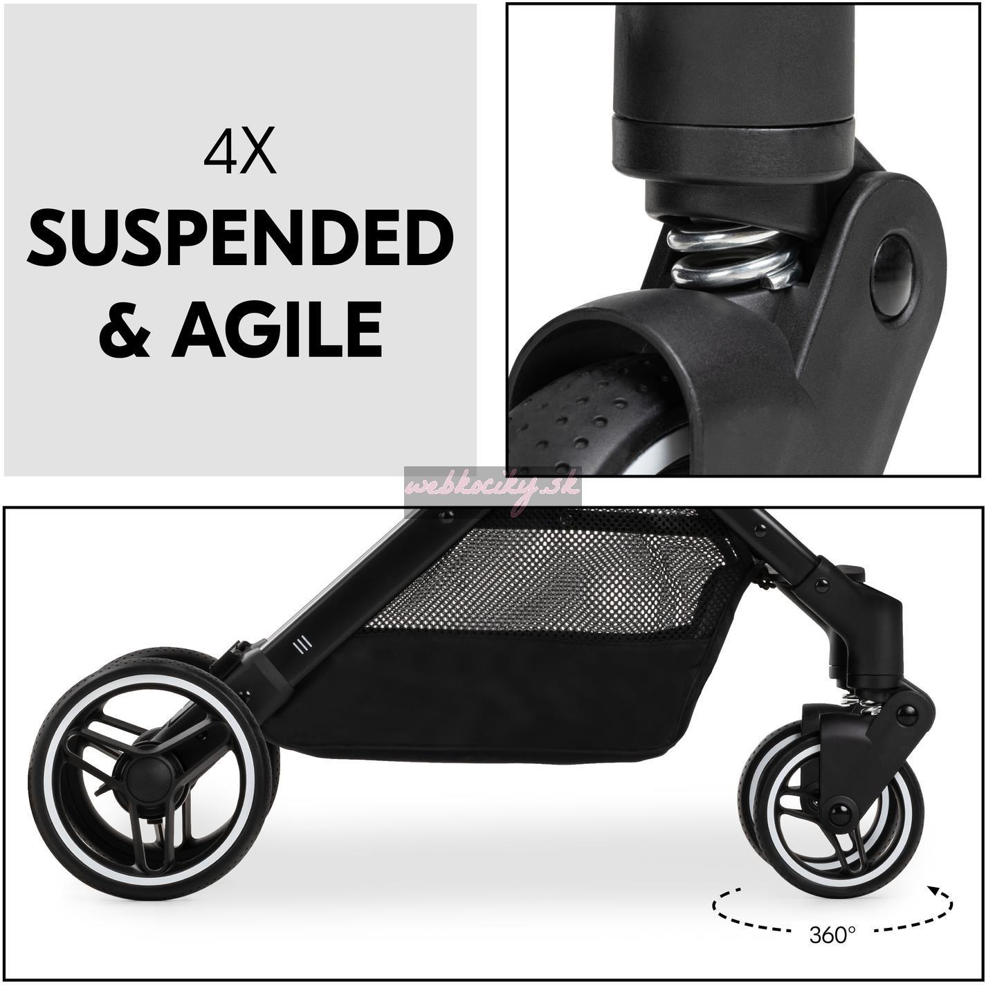 Vďaka veľkým kolesám s hladkým chodom a ochrane pred slnkom môžete cestovať pohodlne a bezpečne bez ohľadu na to, kam smerujete, 4-smerné odpruženie tlmiace nárazy a veľké zadné kolesá odolné proti prepichnutiu zaručujú pohodlie všade. Vďaka otočným predným kolesám o 360 stupňov zvládnete všetky zákruty.