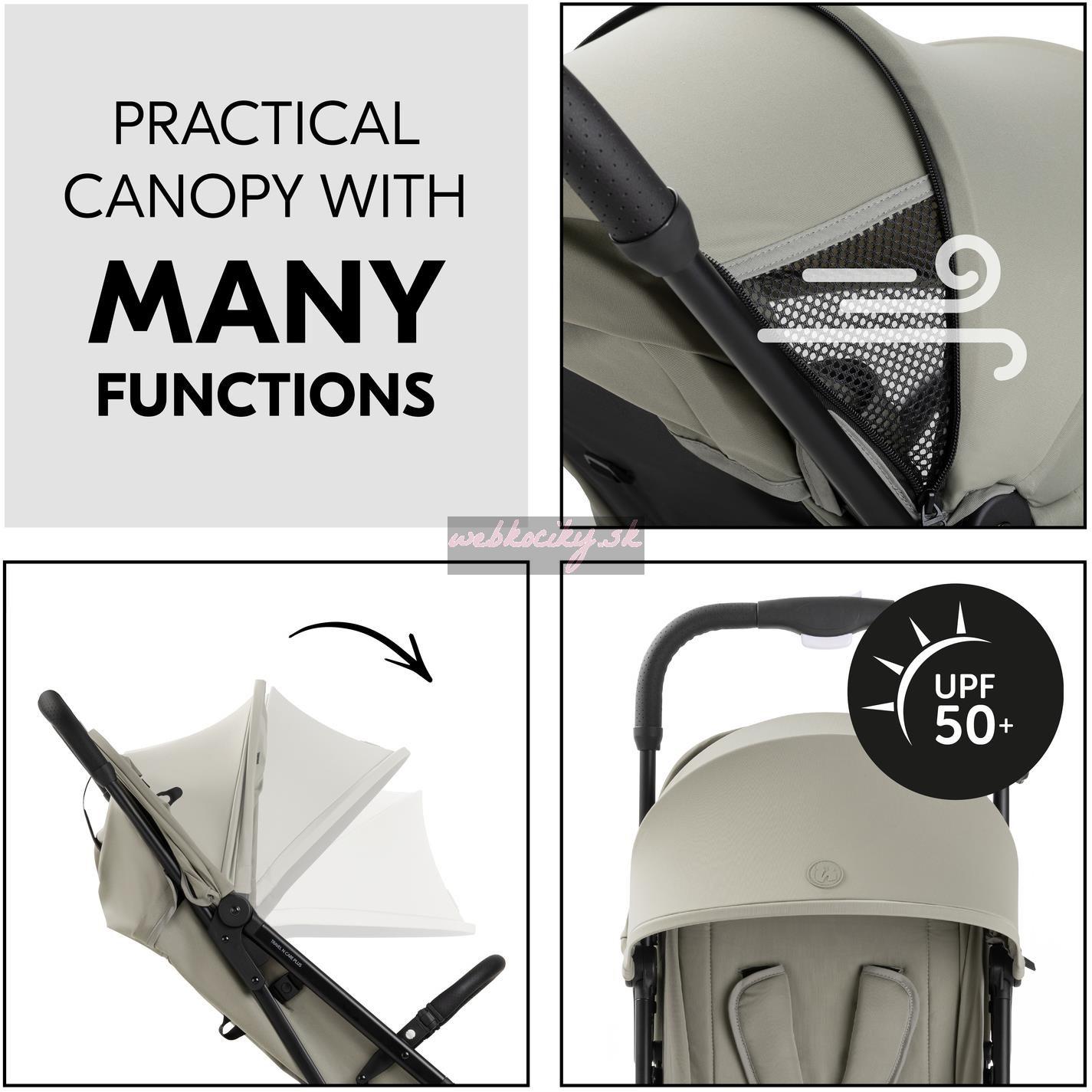 Na spánok môžete opierku chrbta ľahko uviesť do ležiacej polohy jednou rukou. Strieška ponúka veľkú 3-zónovú ochranu pred slnkom (UV ochrana 50+) a vaše dieťatko dostane dodatočný čerstvý vzduch cez sieťované okná.