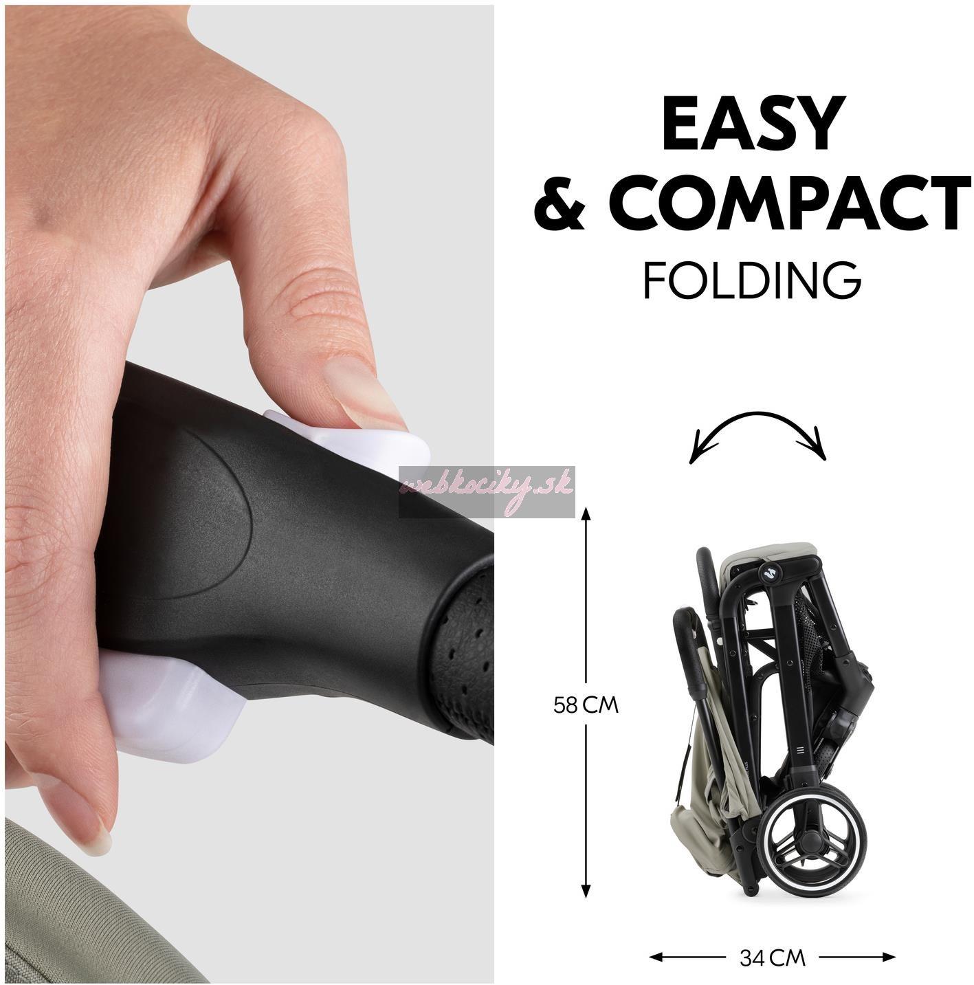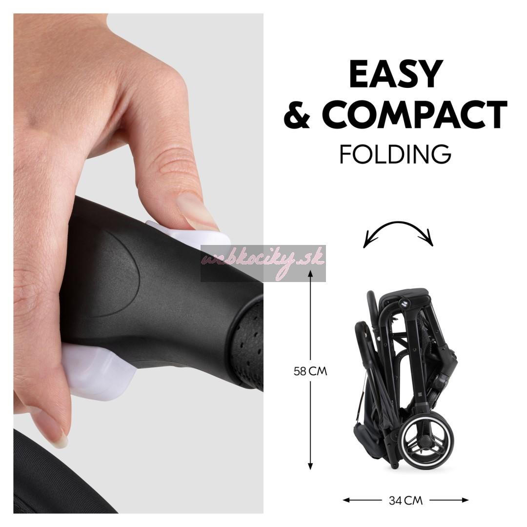 Kompaktný kočík sa navyše dá zložiť do malých rozmerov. Zložte ho rýchlo a jednoducho jednou rukou. Môžete ho uložiť do auta, autobusu, vlaku alebo lietadla, aby ste ušetrili miesto, alebo ho pohodlne nosiť cez rameno pomocou polstrovaného ramenného popruhu. Z kvalitných látok a elegantného dizajnu sa budete dlho tešiť. Ochranná tyč a madlo kočíka sú vo vysokokvalitnom koženom vzhľade a poťah a strieška sú vyrobené zo strečovej látky. Ak sa pri jedle niečo zašpiní, jednoducho odstráňte ľahko udržiavateľný poťah sedadla a vyperte ho v práčke na 30 stupňov.