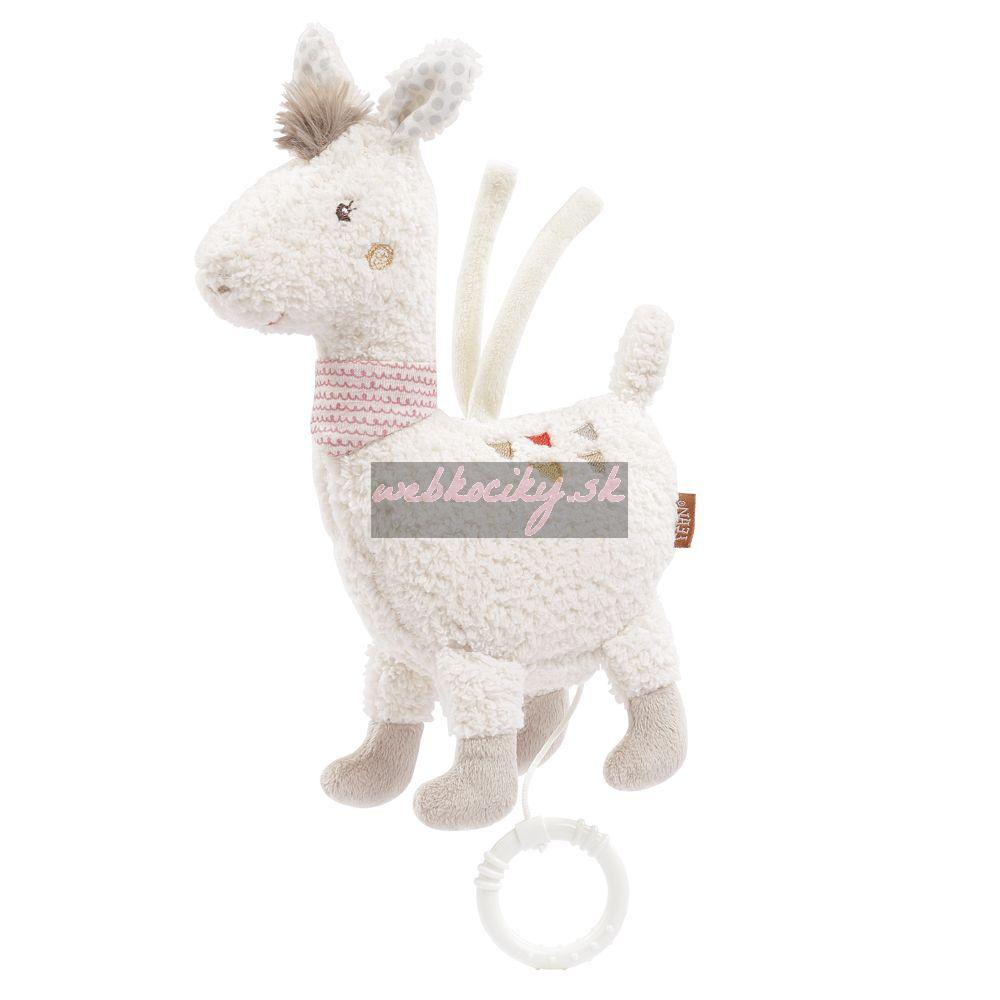 Plyšová lama s hracím strojčekom, ktorý sa spúšťa zatiahnutím za krúžok. Strojček sa dá vybrať, hračka má zips. Príjemné tlmené farby a mäkký materiál podporujú maznanie a upokojujú dieťa. Vďaka dvom popruhom možno hračku rýchlo pripevniť na kočíky, autosedačky a postieľky.