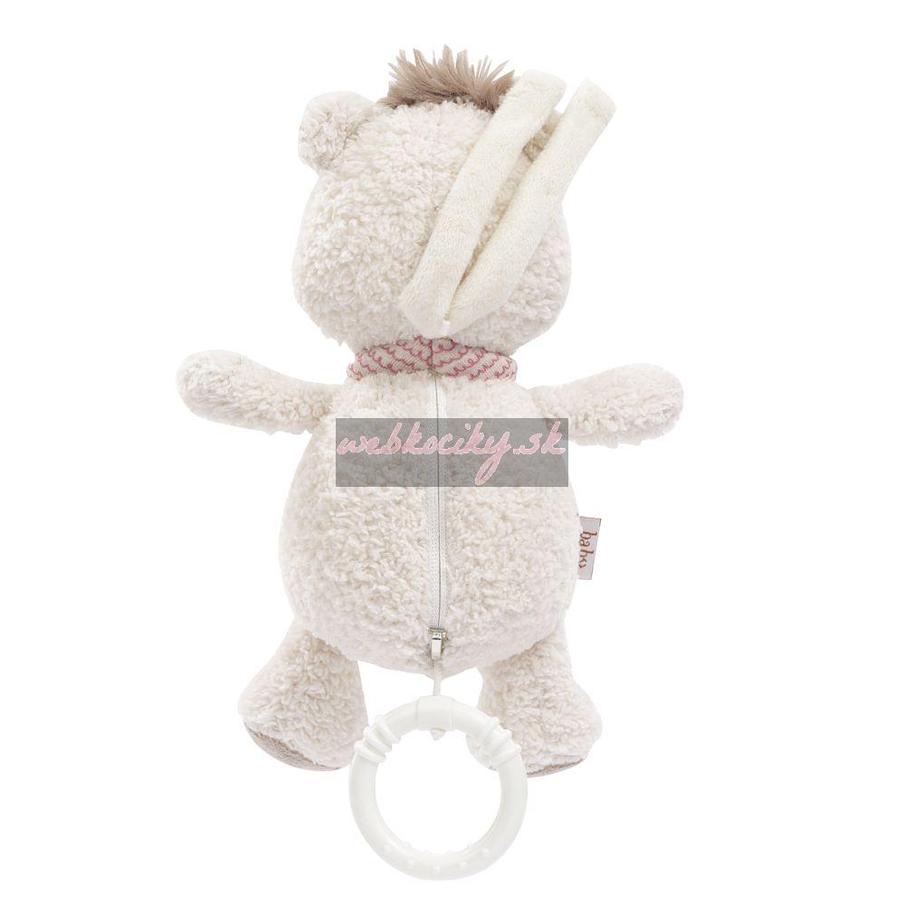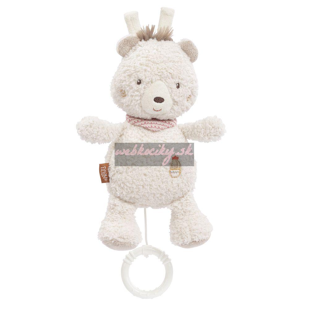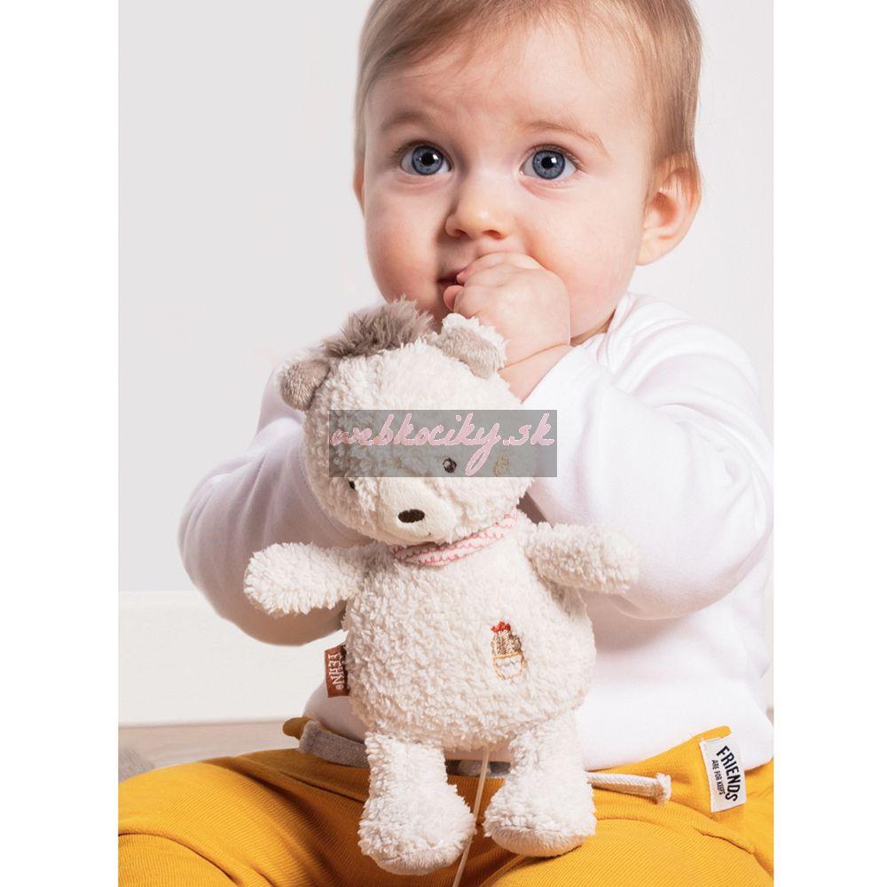 Plyšový medveď s hracím strojčekom, ktorý sa spúšťa zatiahnutím za krúžok. Strojček sa dá vybrať, hračka má zips. Príjemné tlmené farby a mäkký materiál podporujú maznanie a upokojujú dieťa. Vďaka dvom popruhom možno hračku rýchlo pripevniť na kočíky, autosedačky a postieľky.