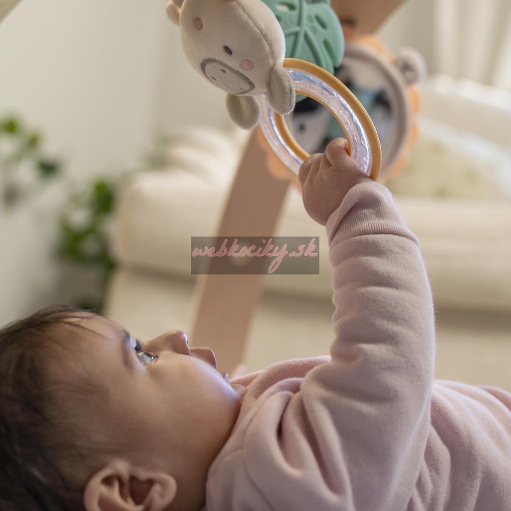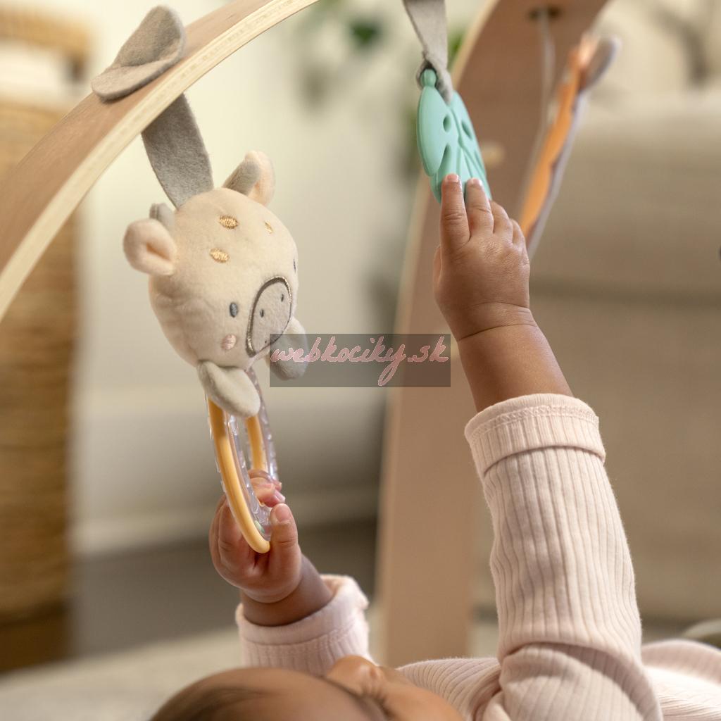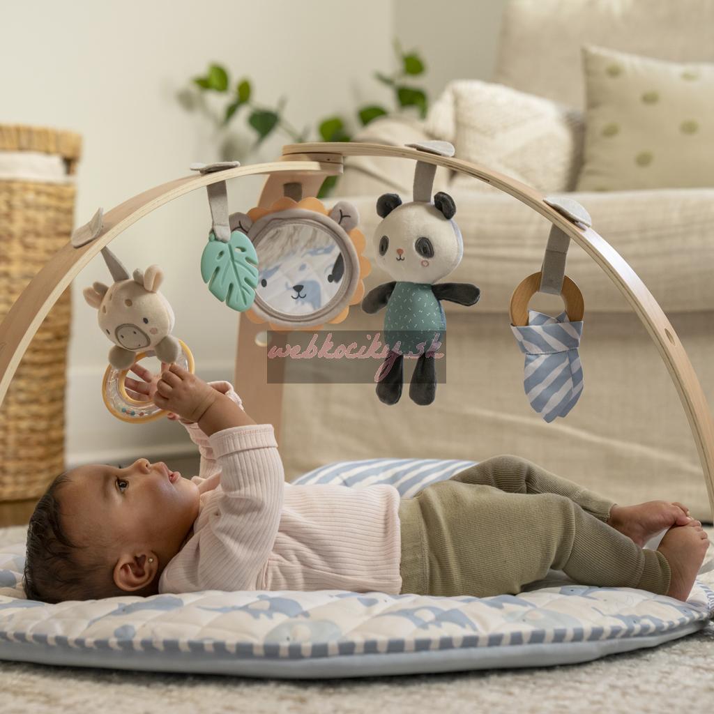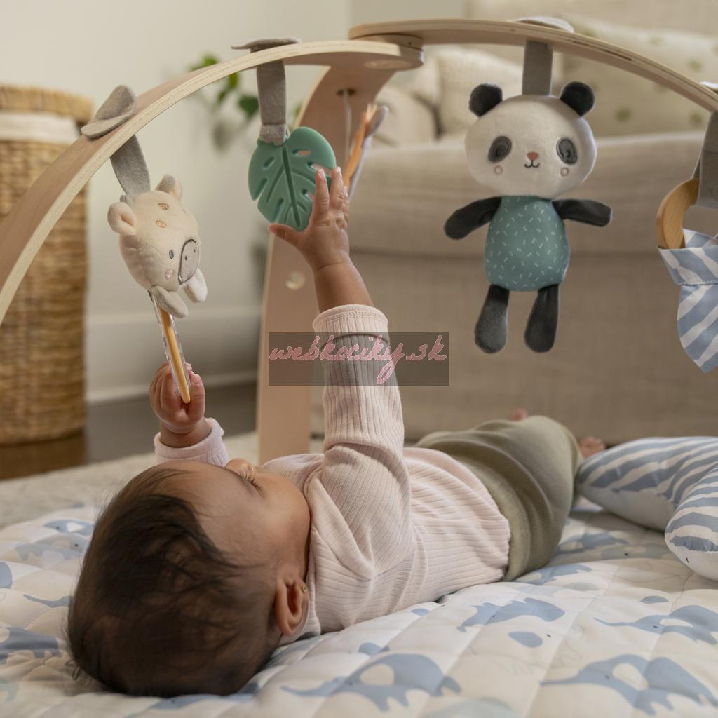 - 5 odnímateľných hračiek: silikónový lístok, plyšová panda, drevený krúžok, zrkadielko s levíkom a hrkálka so žirafou