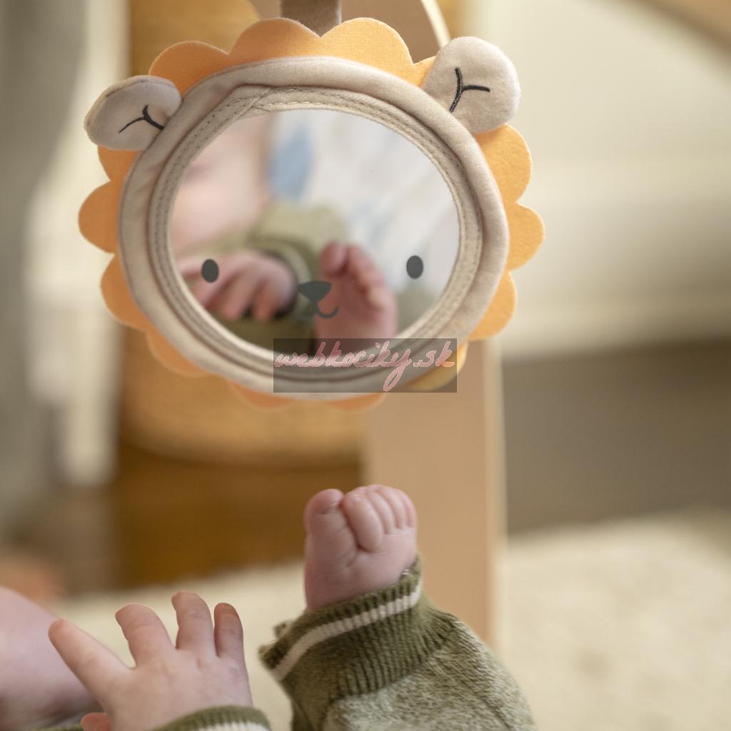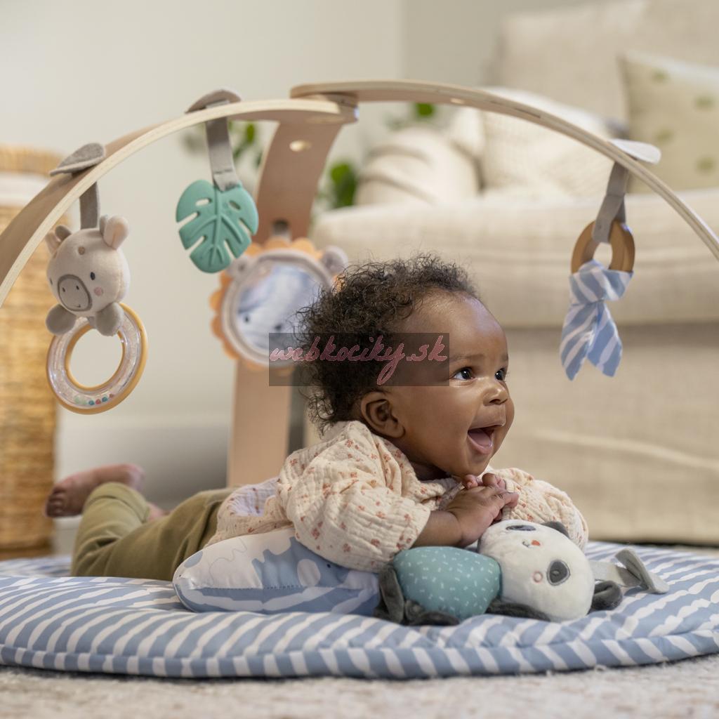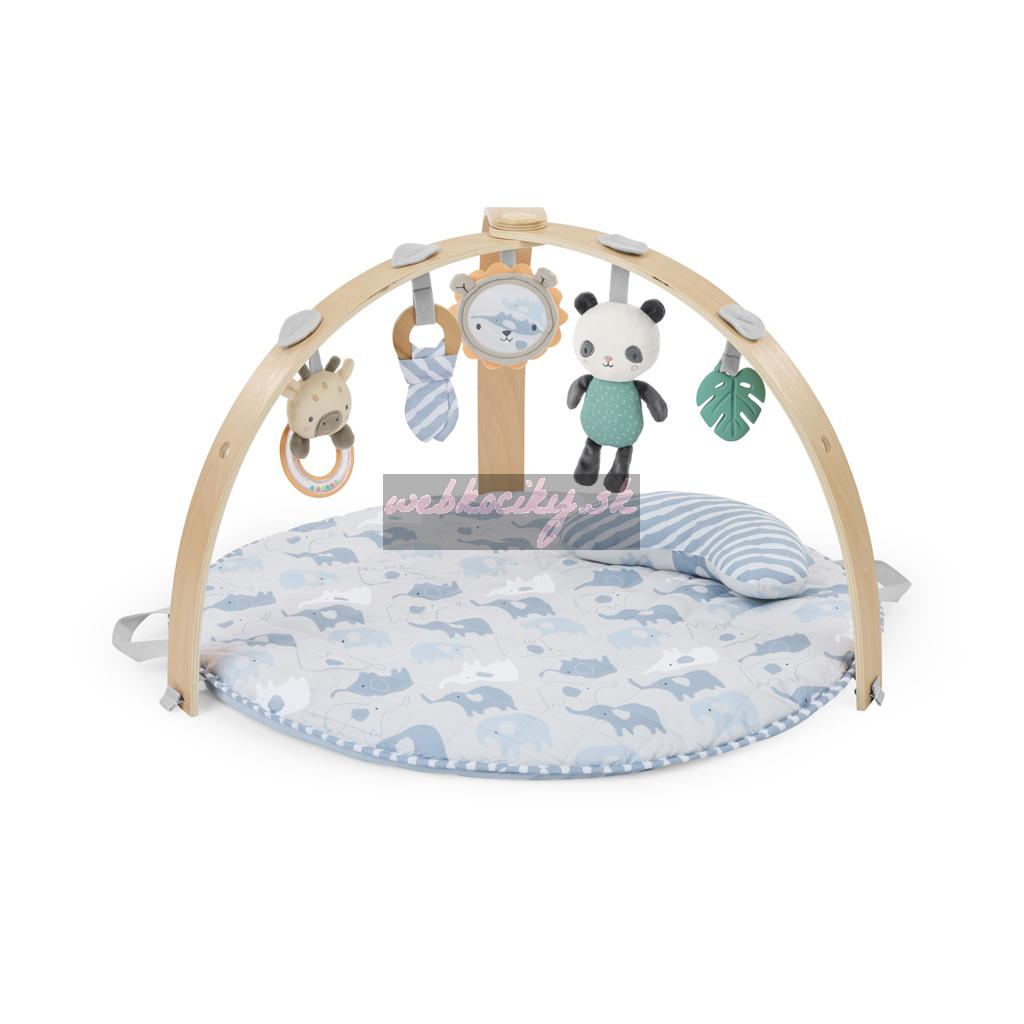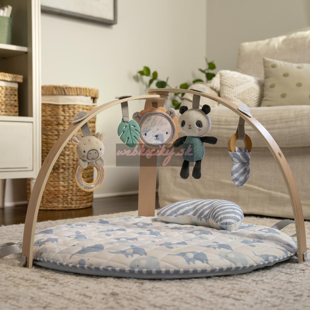 - 5 odnímateľných hračiek: silikónový lístok, plyšová panda, drevený krúžok, zrkadielko s levíkom a hrkálka so žirafou