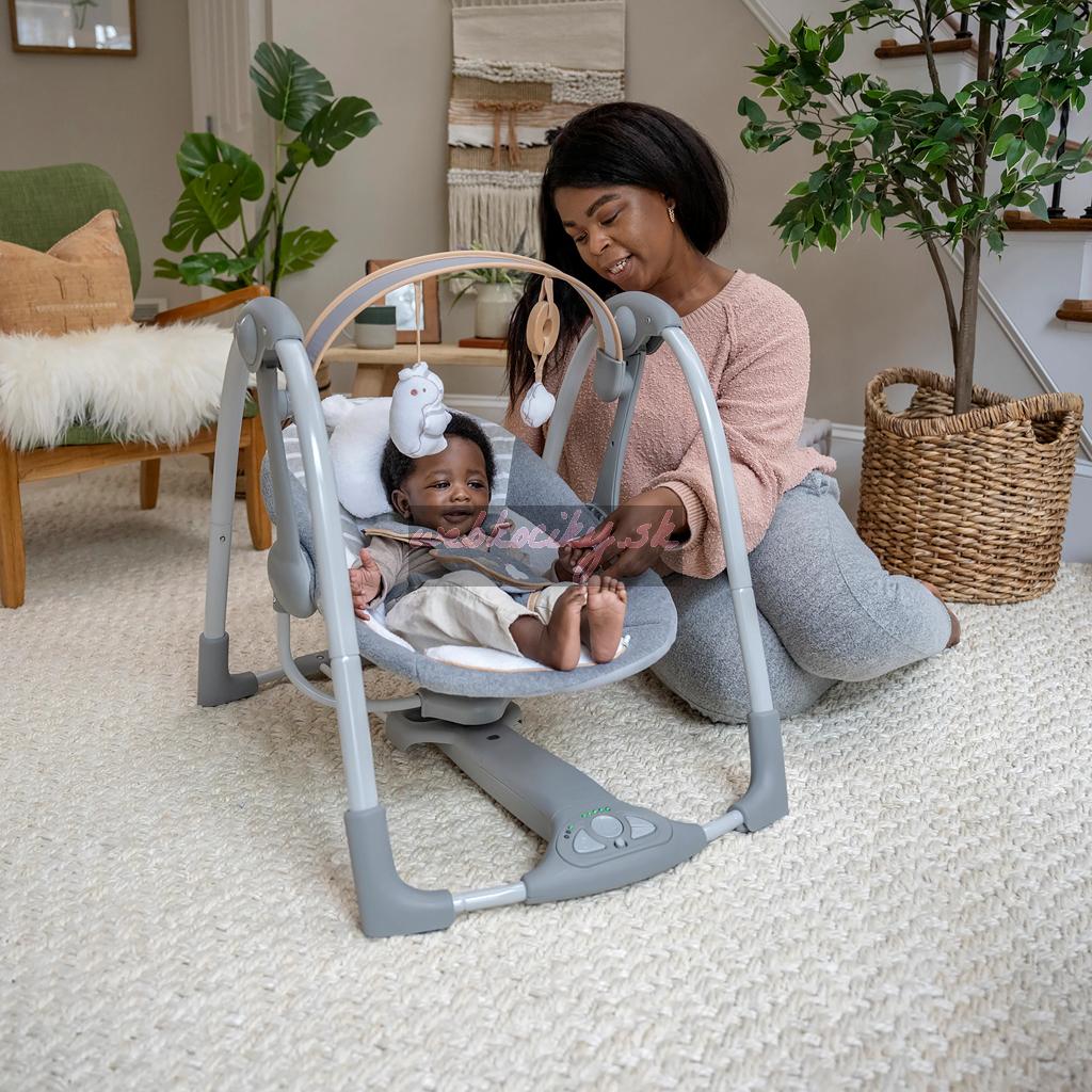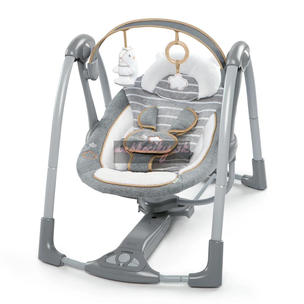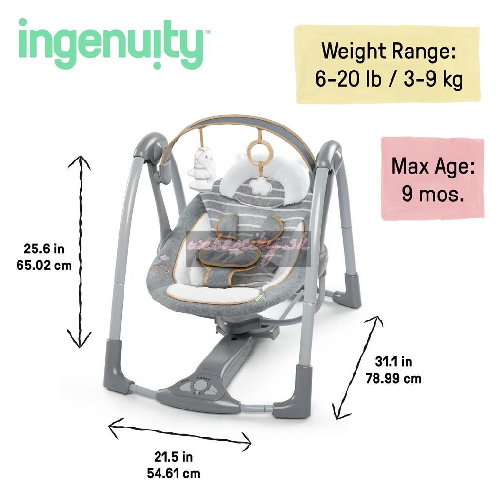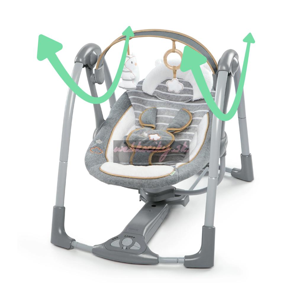 Keď máte pred sebou cestu, prenosná hojdačka Ingenuity Swing 'n Go Vám bude verným spoločníkom. Kompaktná konštrukcia sa jednoducho prenáša a ponúka všetky funkcie, ktoré by ste očakávali od plnohodnotnej hojdačky. Vaše bábätko si môže užívať automatické hojdacie pohyby, počúvať upokojujúce zvuky prírody a melódie a siahať po dvoch plyšových závesných hračkách – roztomilom plyšovom mackovi a obláčiku.