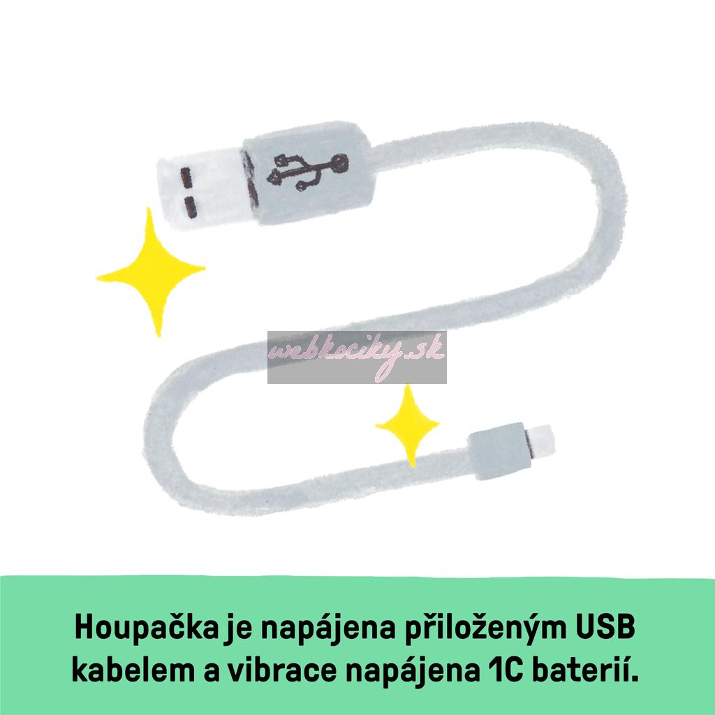Dodávaný USB kábel napája hojdací pohyb a hudbu. 1 C batéria napája vibračnú jednotku (sieťový adaptér a batérie nie sú súčasťou balenia). Batéria vibračnej jednotky sa nachádza v spodnej časti hojdačky v samostatnom priestore a kryt sa dá ľahko odstrániť.