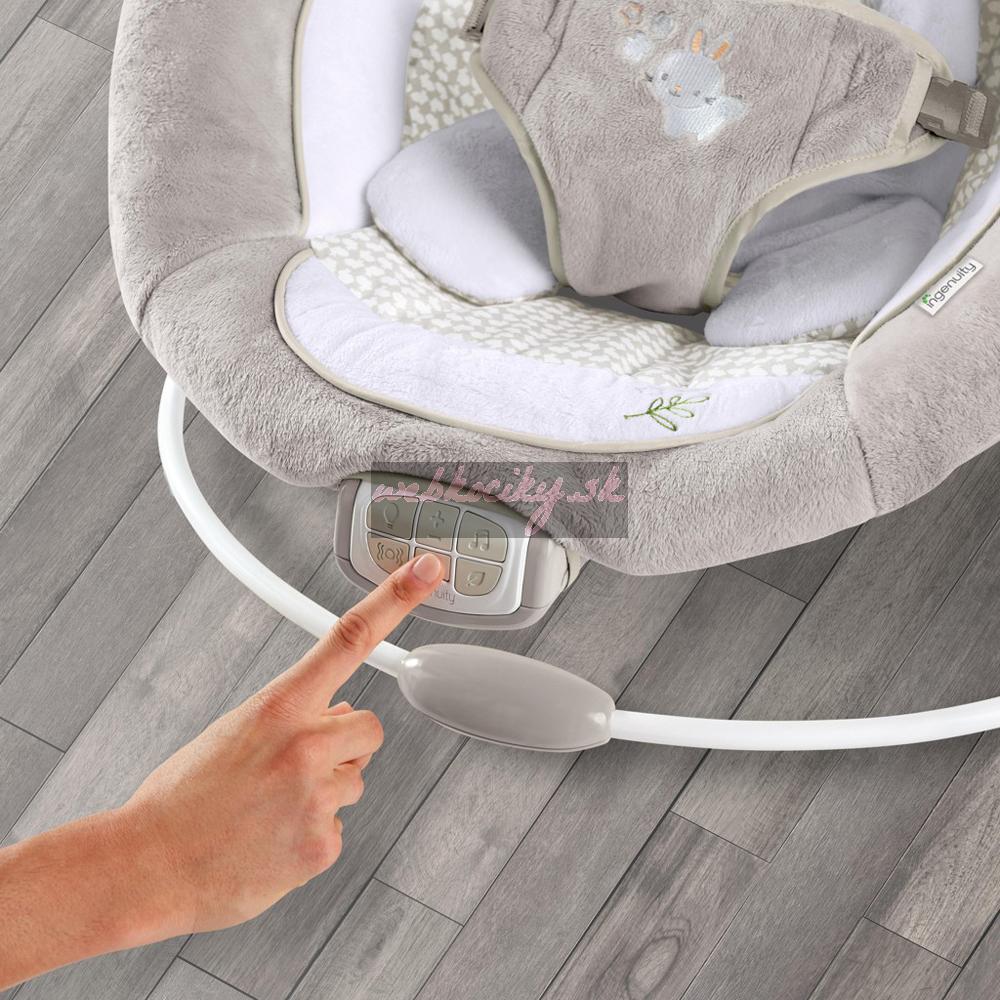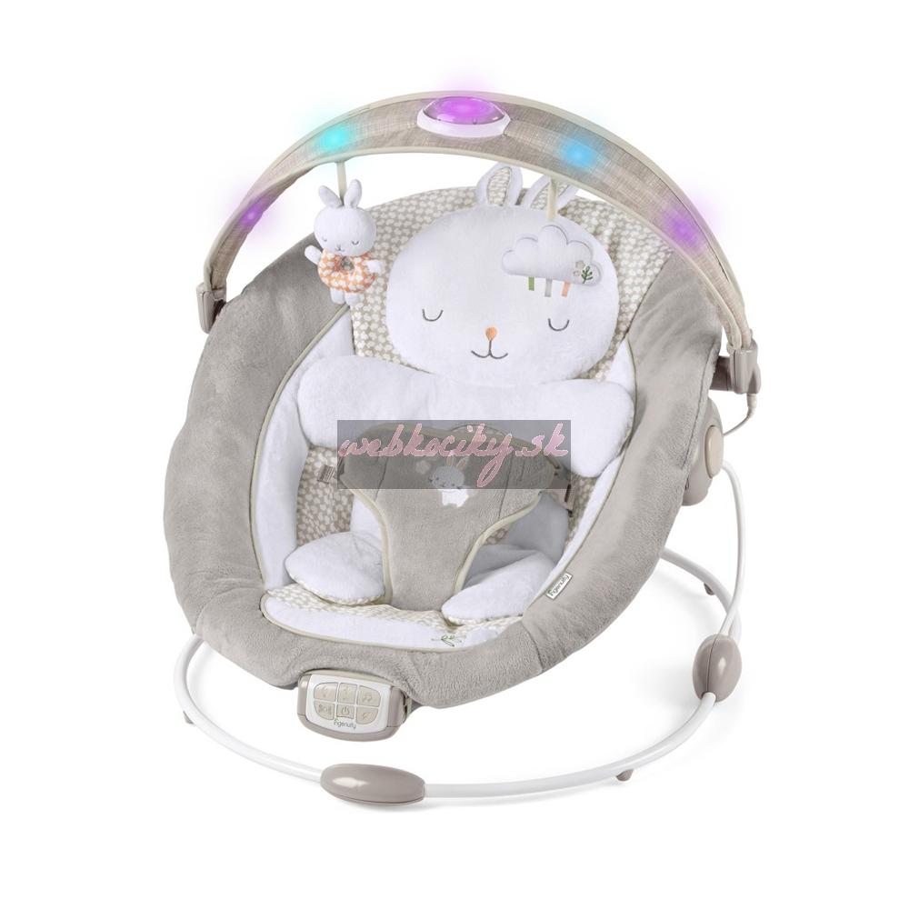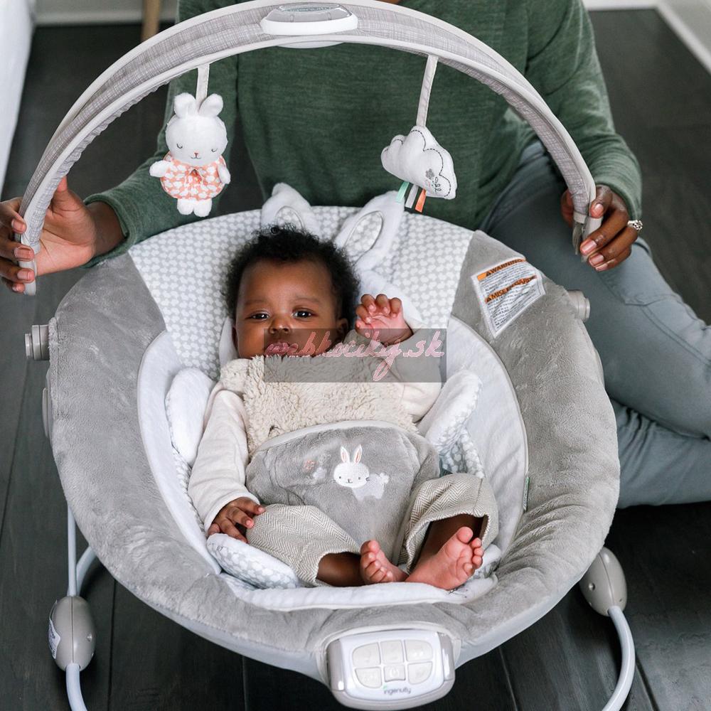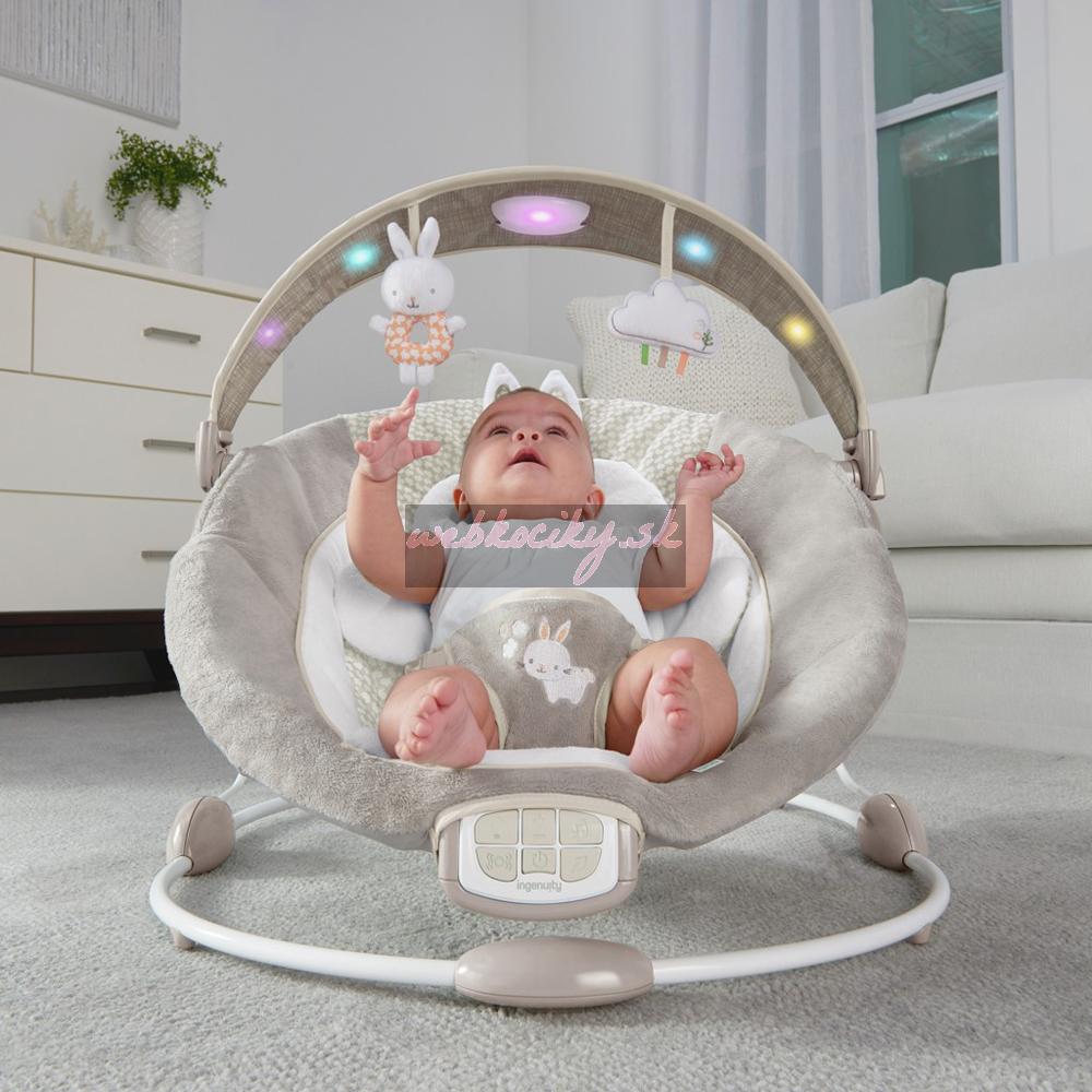 V lehátku Ingenuity Twinkle Tails bude mať bábätko pocit, že je v bezpečnom náručí a tým získa mamička potrebný čas na oddych. Toto lehátko pomáha udržať vaše dieťatko v pokoji a v bezpečí a zaručí mu maximálny odpočinok alebo zábavu. Pohodlná sedacia časť obsahuje vyberateľnú novorodeneckú vložku v tvare zajačika, ktorú môžete využiť ako samostatnú podložku na hranie alebo prebaľovanie. Dieťatko zaujmú jemné svetlá, ktoré tancujú na strieške s hrazdičkou, ktorá navyše obsahuje 2 roztomilé hračky. Príjemné melódie, zvuky prírody, biely šum a jemné vibrácie upokoja každé dieťatko.