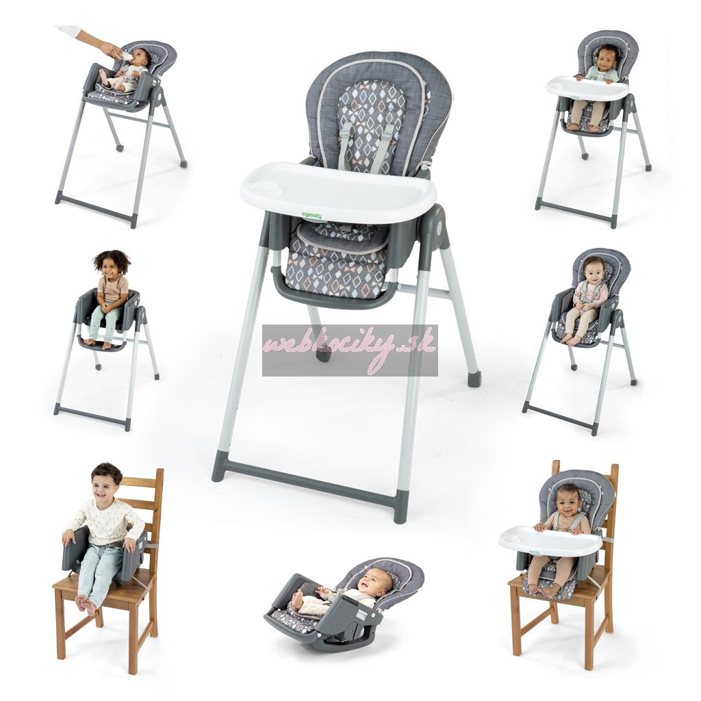 Univerzálna konvertibilná vysoká detská stolička 7v1 od Ingenuity Vám dopraje možnosť, aby Vaše dieťatko bolo pri Vás od jeho prvého dňa. Jedálenská stolička Ingenuity Proper Positioner 7v1 ponúka 7 režimov, v ktorých rastie s dieťaťom od narodenia až do 5 rokov. Podporuje správne držanie tela, čím podporuje lepšie trávenie od novorodenca až po batoľa.
