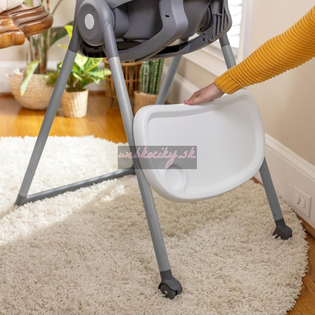 Ergonomický dizajn stoličky pomáha s posturálnou stabilitou, zatiaľ čo viacpolohová nastaviteľná opierka nôh zabraňuje viseniu nôh a ponúka väčšie pohodlie, aby sa dieťa mohlo sústrediť na jedlo. Dizajn sedenia 90/90/90 udržuje nohy dieťaťa v optimálnej polohe v 90-stupňovom uhle, čím podporuje pohodlie a správne držanie tela. Sedaciu podložku a vložku možno prať v práčke.