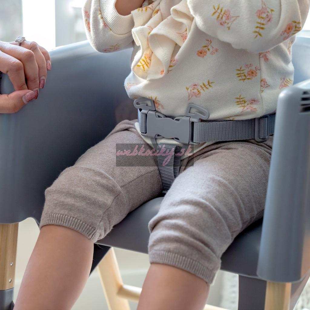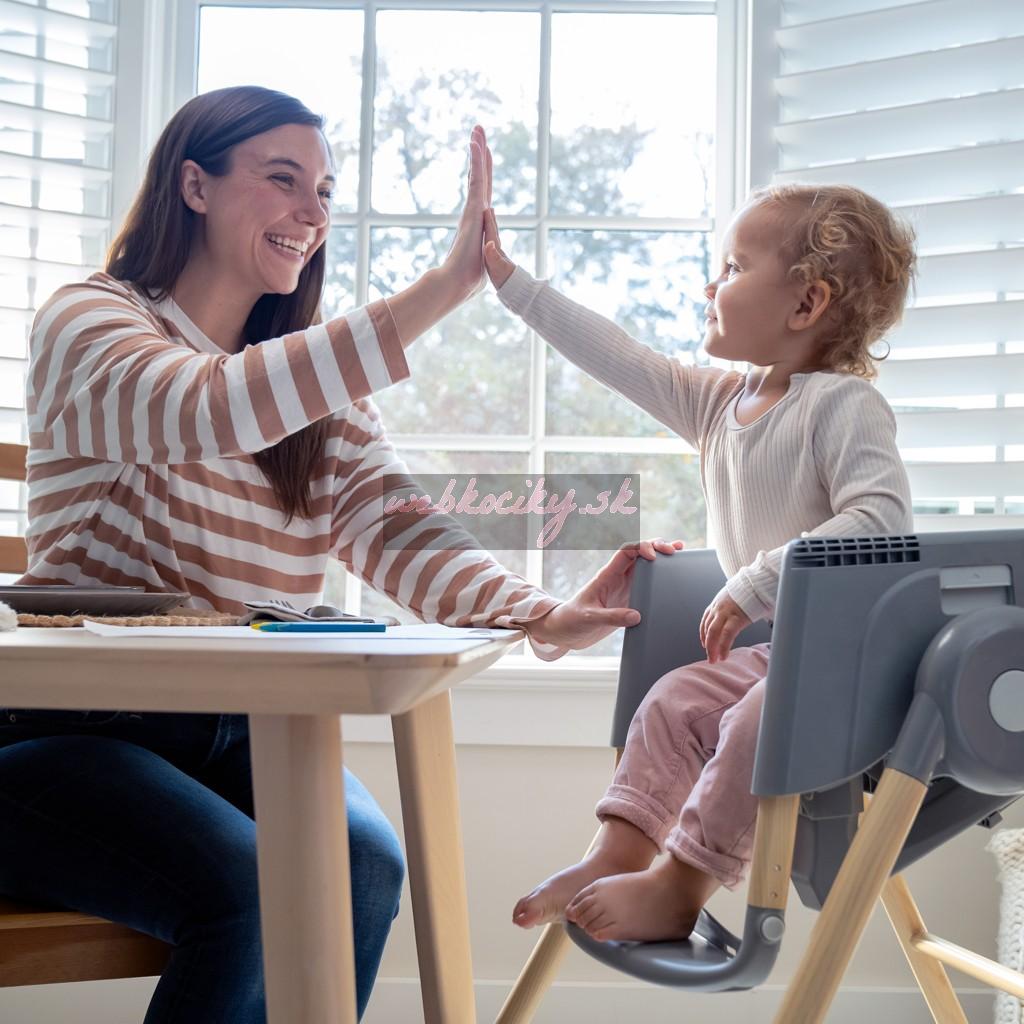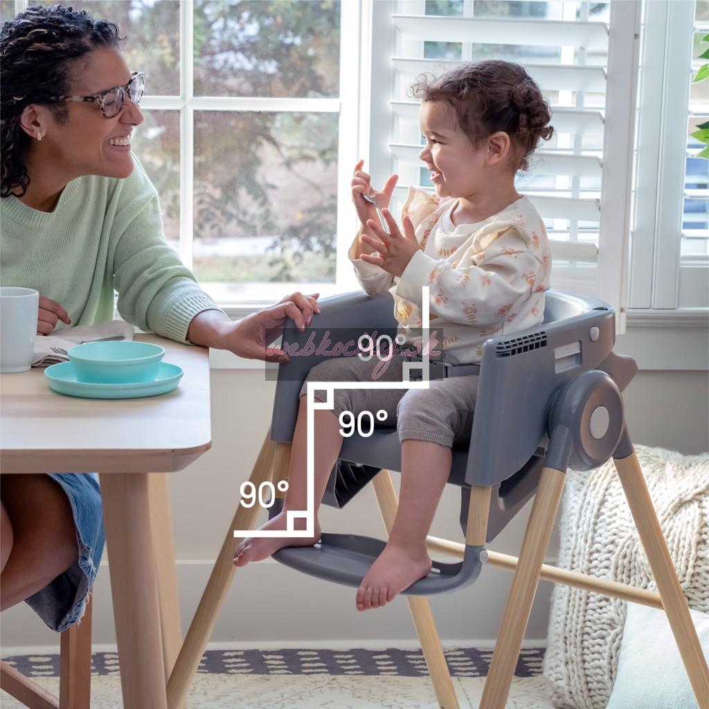 Ergonomický dizajn stoličky pomáha s posturálnou stabilitou, zatiaľ čo viacpolohová nastaviteľná opierka nôh zabraňuje viseniu nôh a ponúka väčšie pohodlie, aby sa dieťa mohlo sústrediť na jedlo. Dizajn sedenia 90/90/90 udržuje nohy dieťaťa v optimálnej polohe v 90-stupňovom uhle, čím podporuje pohodlie a správne držanie tela. Sedaciu podložku a vložku možno prať v práčke.