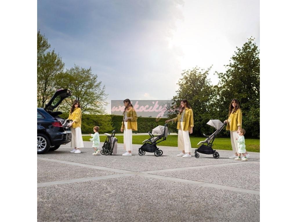 Špeciálne automatické skladanie sa aktivuje dotykom a v okamihu sa kočík sám zloží. Po zložení zostane stáť s rukoväťou nahor, takže ani rukoväť ani poťah sa nedotýkajú zeme, preto všade zachováte maximálnu hygienu.