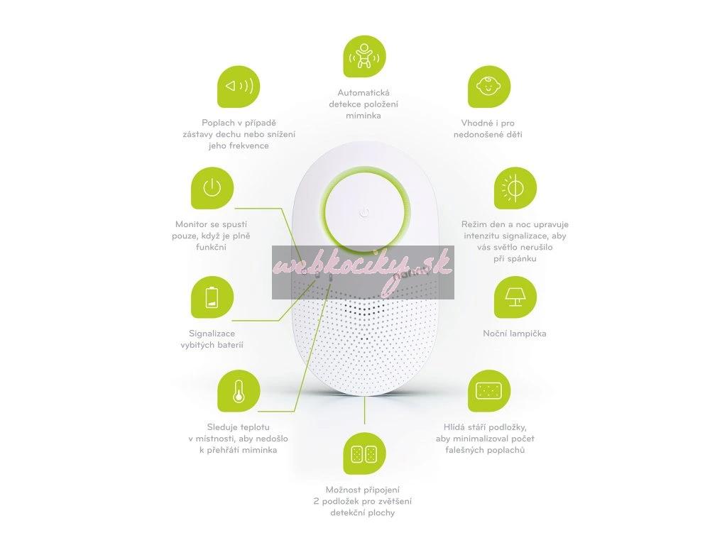prostredí. Účelom výrobku je včas upozorniť optickým a akustickým signálom na zástavu alebo pokles frekvencie dýchania. Varuje tak pred prípadným nebezpečenstvom zástavy dýchania, ktorá sa u malých detí môže vyskytnúť napríklad v dôsledku tzv. syndrómu náhleho úmrtia dojčaťa – SIDS, alebo v dôsledku iných príčin (dusenie, prejavy choroby apod.). Z dôvodu povahy a účelu použitia nie sú známe žiadne vedľajšie účinky a iné kontraindikácie.