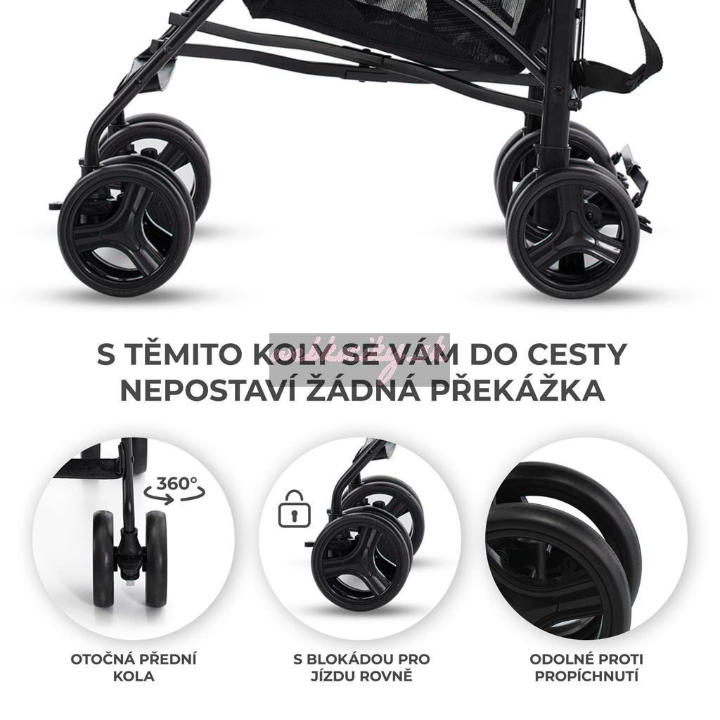 Kolesá kočíka sú ľahké a odolné voči prepichnutiu - a nemusíte ich ani pumpovať. Sú skvelé na dovolenku typu city-break, na oddych v dovolenkovom rezorte alebo na prechádzky mestom. Predné kolesá môžete zablokovať na jazdu po nerovnom povrchu.