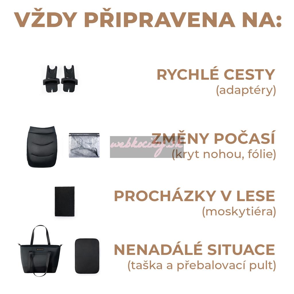 Príslušenstvo: taška s prebaľovacou podložkou, pláštenka, nánožník, moskytiéra, matrac do vaničky, univerzálne adaptéry