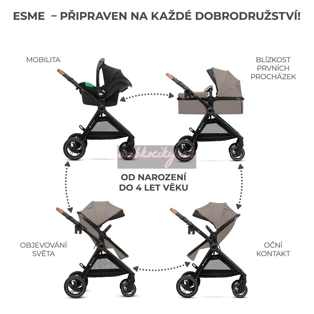 ESME sa dá zložiť do kompaktnej veľkosti a obsahuje funkciu TRAVEL SYSTEM (autosedačka a adaptéry sú súčasťou balenia). Kočík ESME 3 v 1 je tiež vybavený veľkými gumovými kolieskami TPE s tlmením nárazov, vhodnými do každého terénu - sú odolné proti prepichnutiu a nevyžadujú pumpovanie. ESME je kočík, ktorý vás bude sprevádzať ako na každodenných prechádzkach, tak na dlhších výletoch na dovolenke.