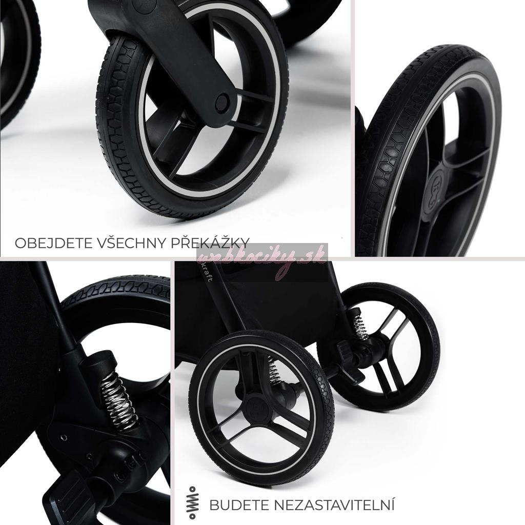 - Veľké kolesá s tlmičmi nárazov umožňujú jednoduché zdvihnutie kočíka a nevyžadujú pumpovanie.