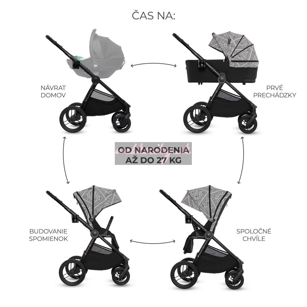 - Od narodenia do 22 kg – kočík má veľkú vaničku s mäkkým matracom, ktorú môže dieťa používať do 9 kg alebo do chvíle, keď sa začne prevracať. Sedadlo kočíka je možné namontovať smerom dopredu alebo dozadu voči smeru jazdy.