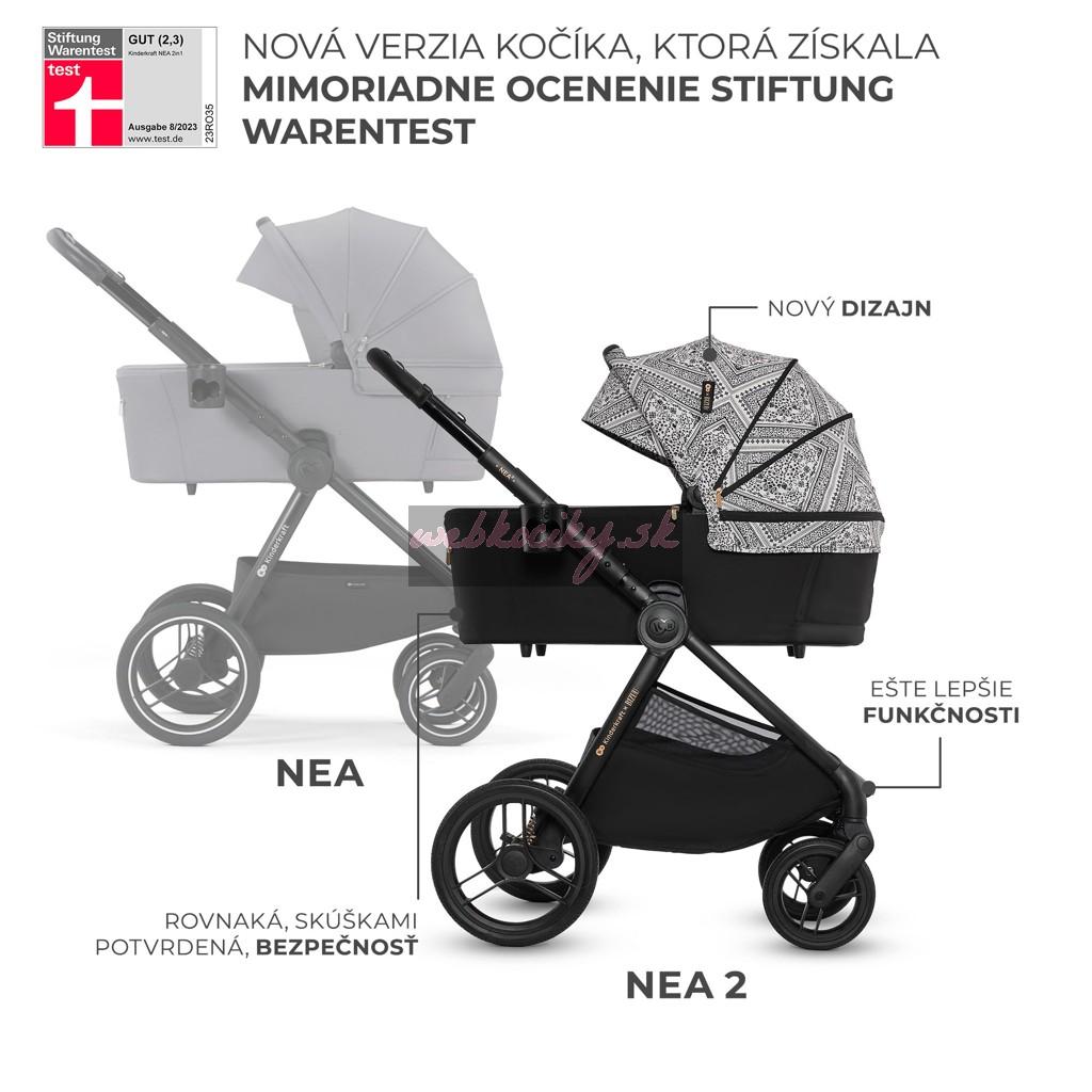 Toto je NEA 2 - multifunkčný kočík 2v1, ktorý vzbudí váš záujem kompaktným dizajnom a kolesami do každého terénu. Veľké kolesá vám bez väčších problémov umožnia prekonať vysoké obrubníky, či nerovné mestské chodníky. NEA 2 je odpoveďou na potreby moderných rodičov, ktorí hľadajú stabilný, pevný, no napriek tomu dobre ovládateľný kočík. Okienko na strieške vám umožní jednoduchú kontrolu, či batoľa počas prechádzky zaspalo, a keď sa náhodou stane, že dieťa kočík zašpiní - poťah na pranie ľahko stiahnete. Brzda STOP & RIDE umožňuje ľahké zaistenie a odistenie kočíka a jednoduchý systém skladania a praktické riešenia ako sú SELF STANDING alebo AUTO LOCK uľahčujú prepravu a skladovanie.