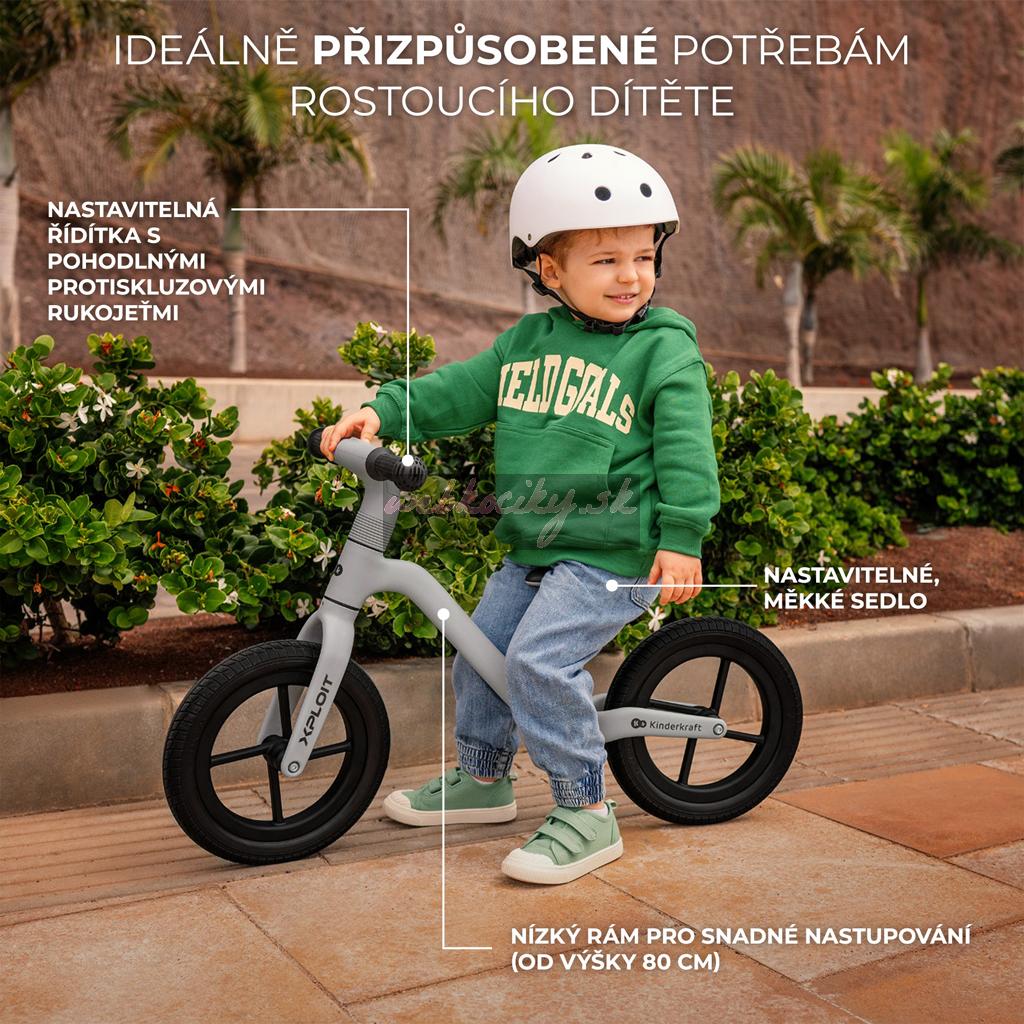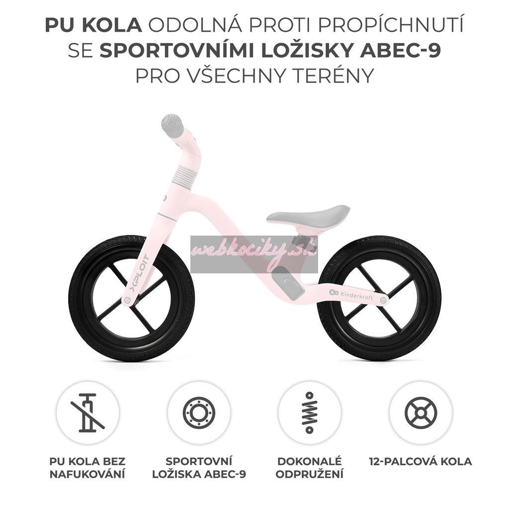 Jeho veľkou výhodou sú veľké PU kolesá, odolné proti prepichnutiu, sú odpružené a majú dobrú priľnavosť k povrchu, vďaka čomu sú vhodné ako na asfaltové, mestské cesty, tak aj na lesné cestičky. Majú športové ložiská 9ABEC, vďaka nim má detský bicykel plynulejší chod, čo uľahčuje učenie sa jazdy. Detské odrážadlo XPLOIT učí a zároveň zabáva: vaše dieťa bude ľahšie získavať schopnosť udržať rovnováhu a stabilitu a tiež ho pripraví na učenie sa bicyklovať s pedálmi.