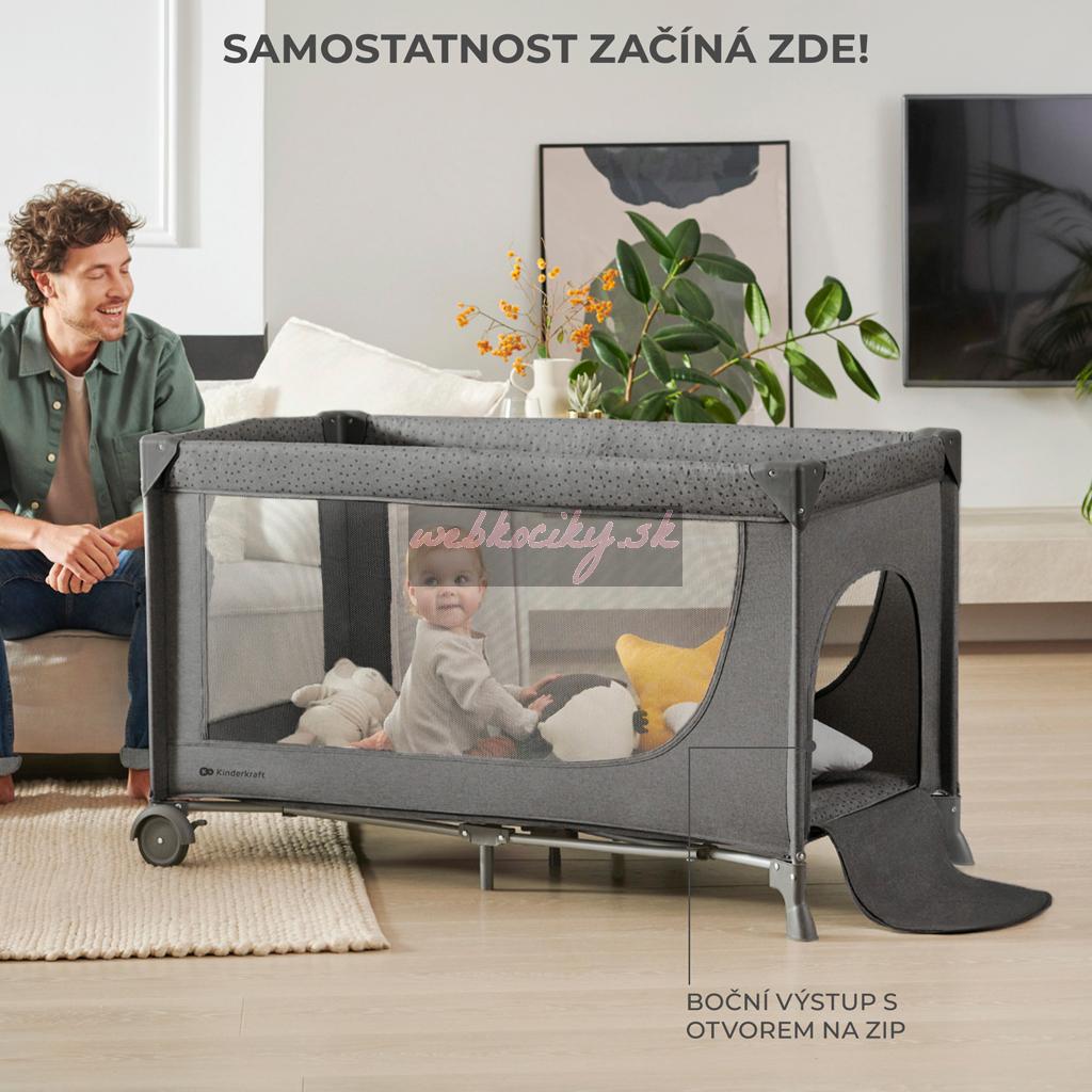 Detská postieľka 2v1 - JOY 2 je jediná postieľka, ktorá spĺňa až 2 funkcie: postieľka pre staršie dieťa a cestovná postieľka. Detská postieľka má na boku výstup na zips, takže vaše dieťatko môže samostatne opustiť svoj hrací priestor.