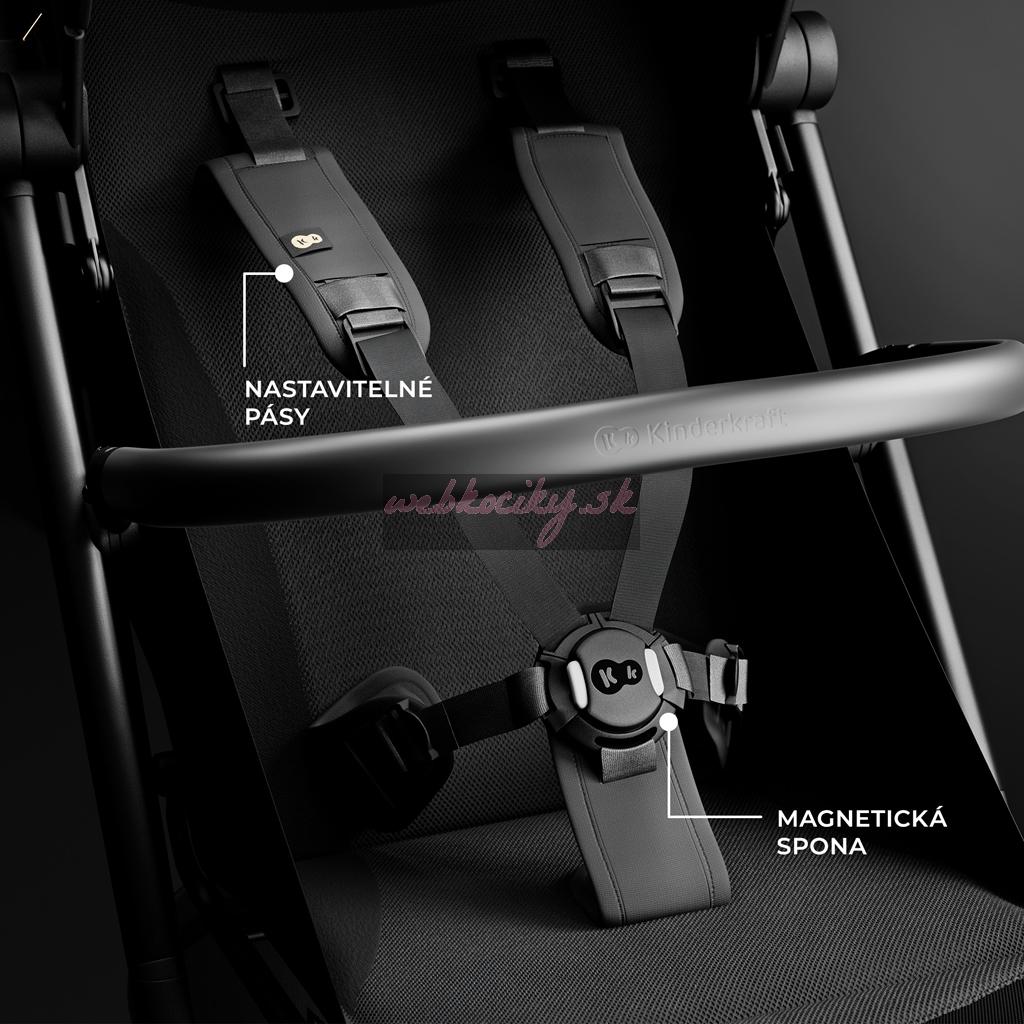 Magnetické, päťbodové bezpečnostné pásy zaručujú bezpečnosť a jednoduché používanie - zapnutie a odopnutie trvá len chvíľu. Bezpečnostný pás je tiež vybavený pohodlným výškovým nastavením, ktoré vám umožní prispôsobiť ho výške dieťaťa alebo hrúbke oblečenia bez toho, aby ste ho museli znova zapínať. Otočný nárazník, ktorý sa dá z oboch strán odobrať, navyše uľahčuje nakladanie a vyberanie dieťaťa z kočíka a poskytuje rodičom maximálny komfort.