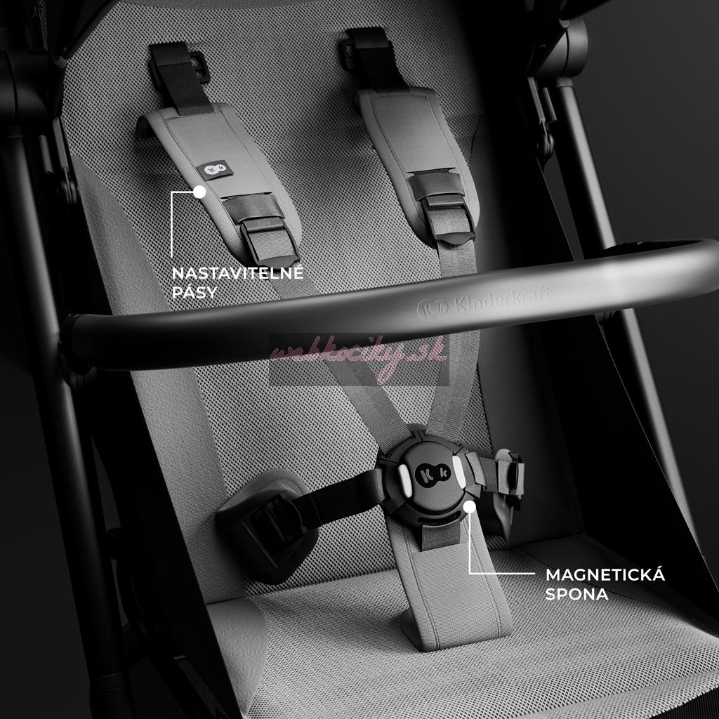 Magnetické, päťbodové bezpečnostné pásy zaručujú bezpečnosť a jednoduché používanie - zapnutie a odopnutie trvá len chvíľu. Bezpečnostný pás je tiež vybavený pohodlným výškovým nastavením, ktoré vám umožní prispôsobiť ho výške dieťaťa alebo hrúbke oblečenia bez toho, aby ste ho museli znova zapínať. Otočný nárazník, ktorý sa dá z oboch strán odobrať, navyše uľahčuje nakladanie a vyberanie dieťaťa z kočíka a poskytuje rodičom maximálny komfort.