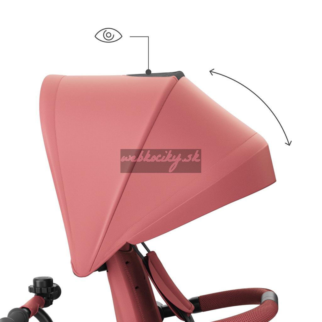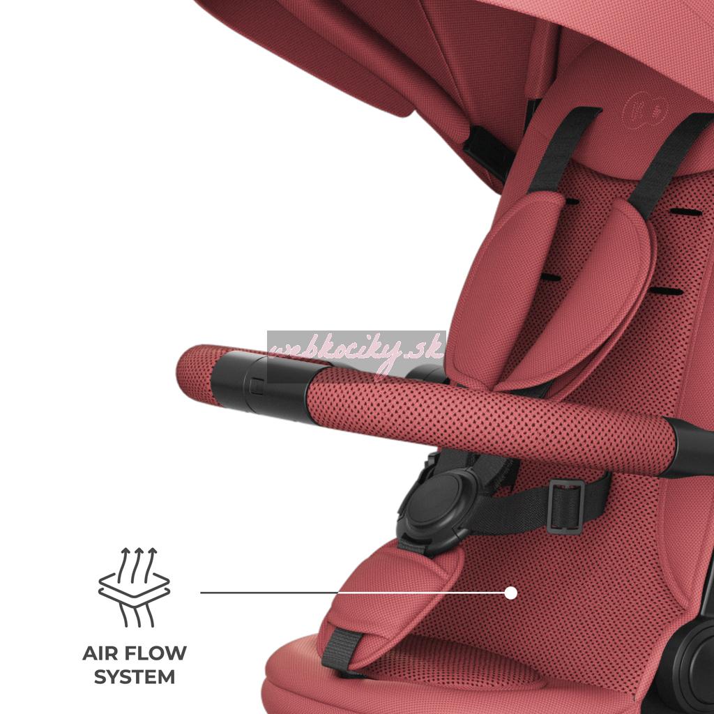 Na dlhších trasách výrazne pomáha pololežiaca poloha, dostupná ako po smere jazdy, tak proti smeru jazdy. Keď dieťa únavou zavrie oči, rodič rýchlo sklopí opierku a pokračuje v prechádzke bez narušenia denného rytmu. Pri jazde proti smeru jazdy môže dieťa odpočívať a vidieť na starajúcu osobu, čo často uľahčuje upokojenie a zaisťuje maximálny pocit bezpečia. Pohodlie dopĺňajú ventilované vložky AIR FLOW a nastaviteľná strieška s okienkom - ľahko ju prispôsobíte počasiu a počas jazdy na dieťa vidíte.