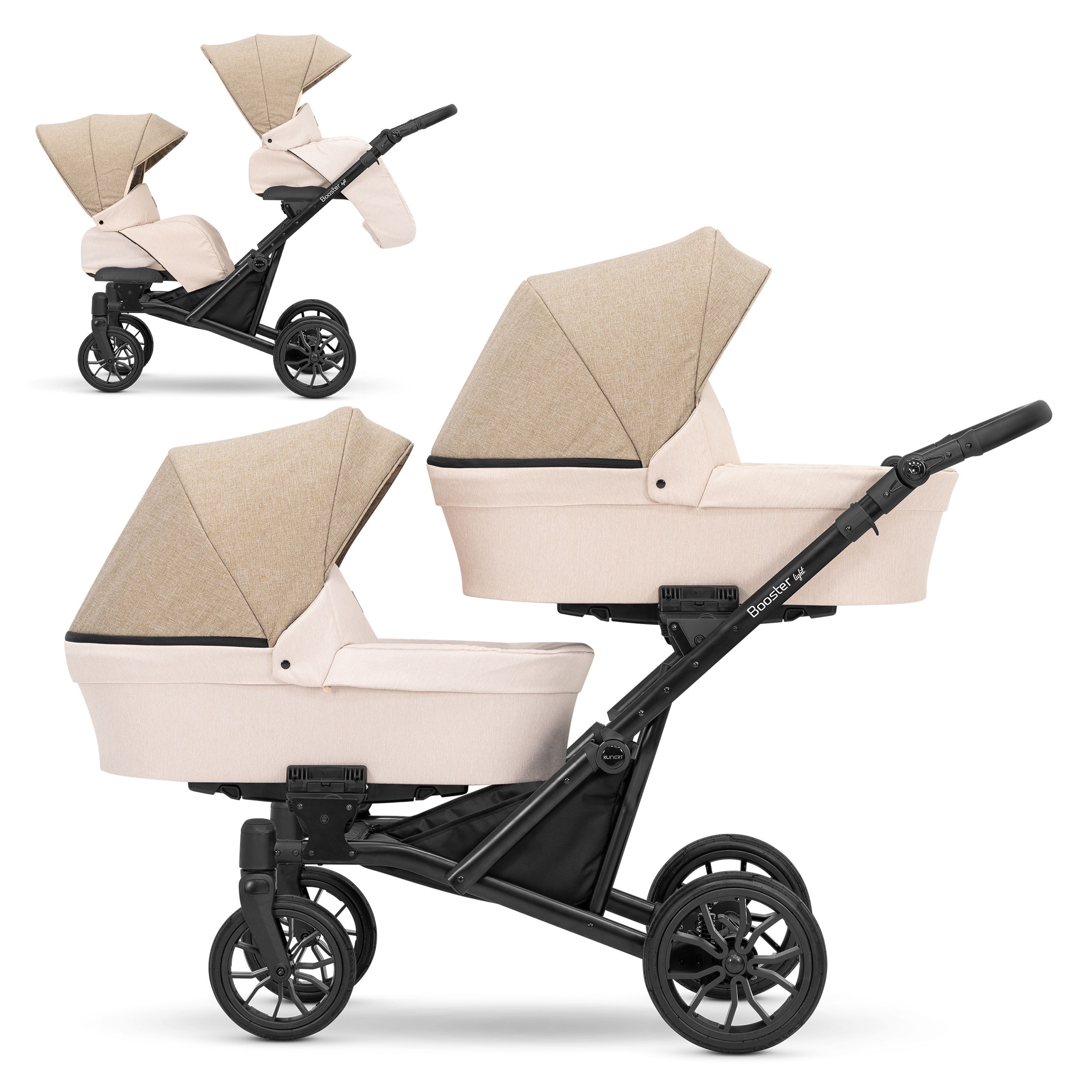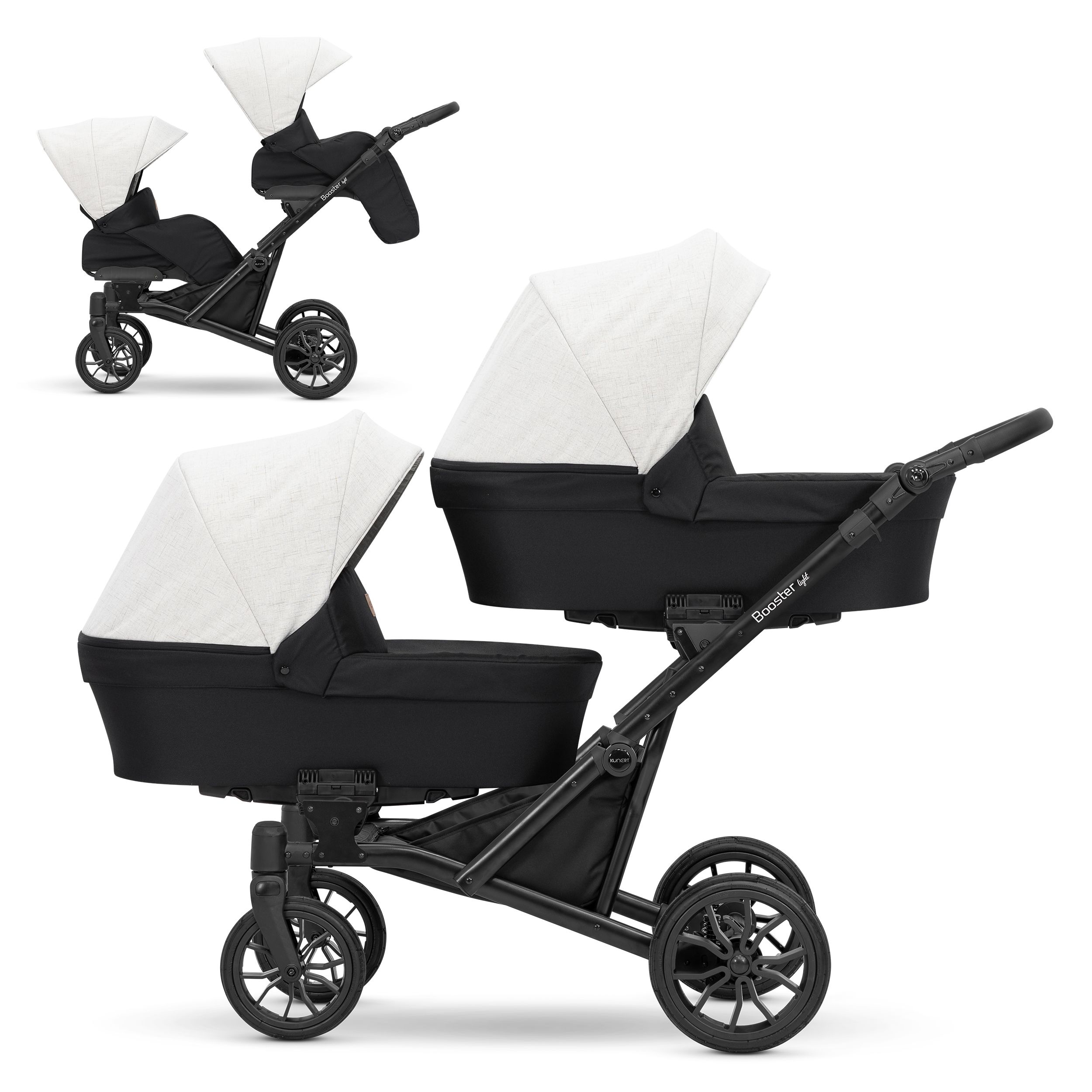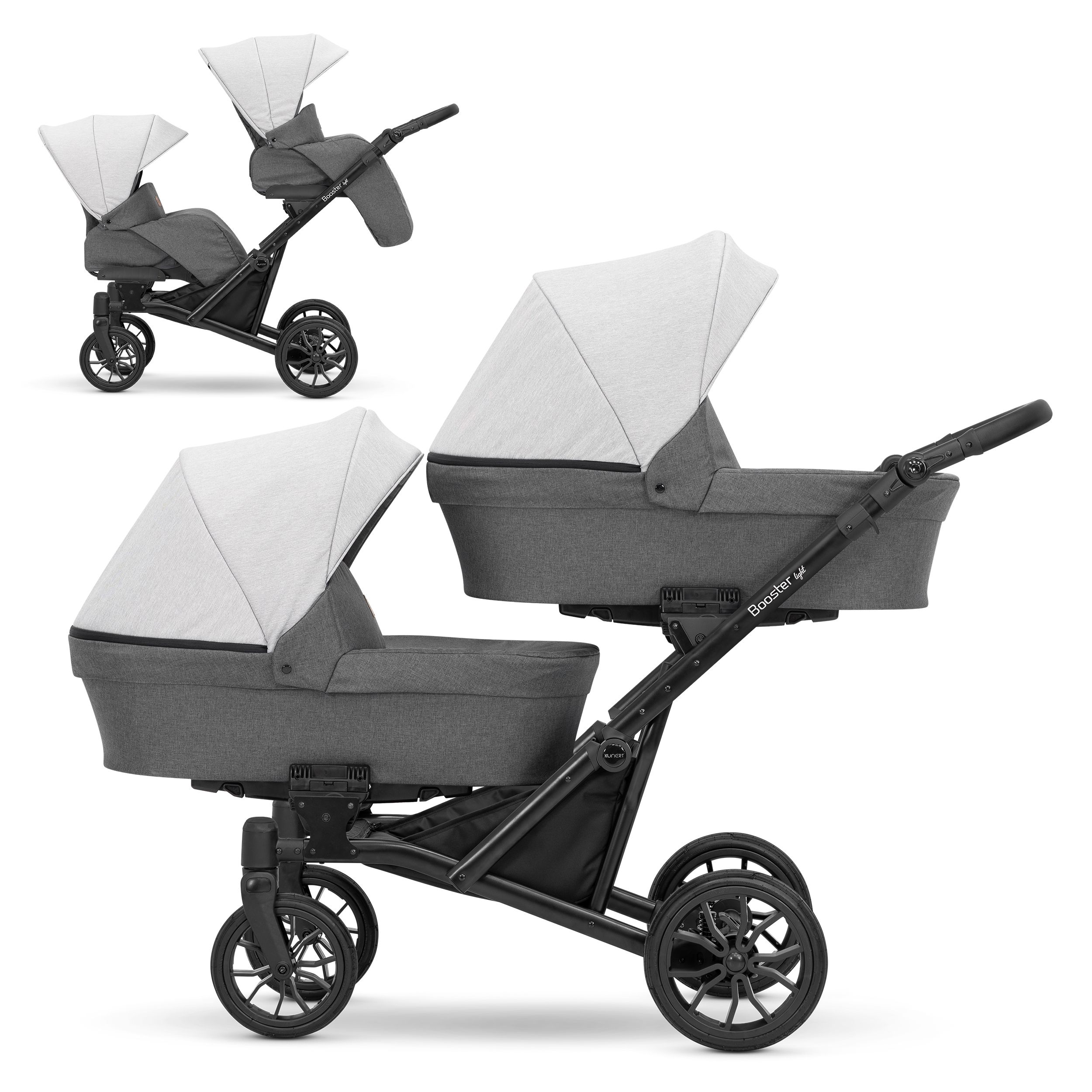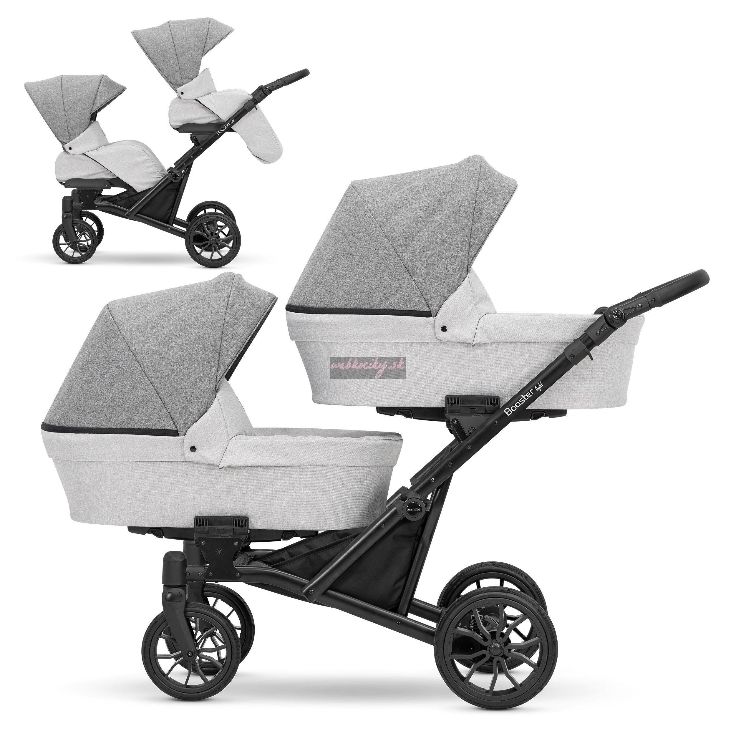 Moderný kočík pre dvojčatá alebo deti s malým vekovým rozdielom. Konštrukcia kočíka je výnimočne pevná a stabilná vďaka čomu je kočík ľahko ovládateľný. Možnosť voľne kombinovať vaničky a sedačky robí z kočíka multifunkčný a univerzálny.