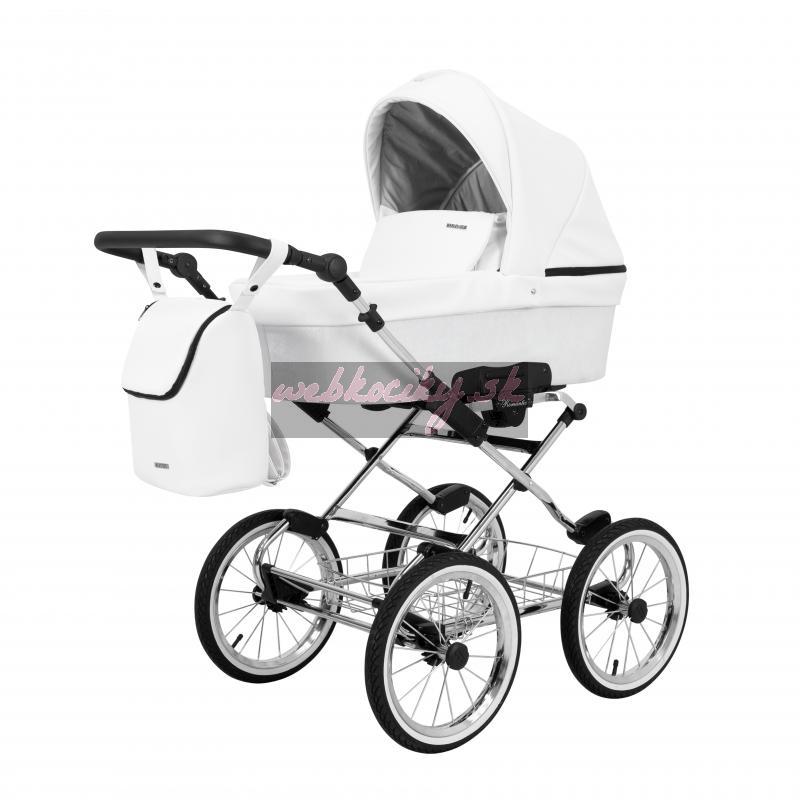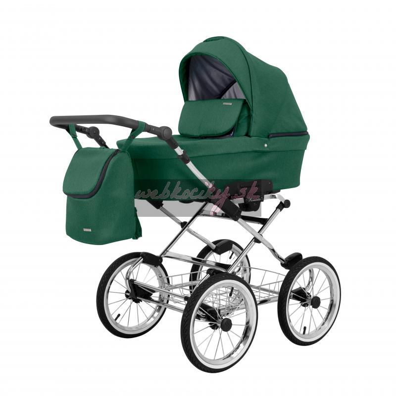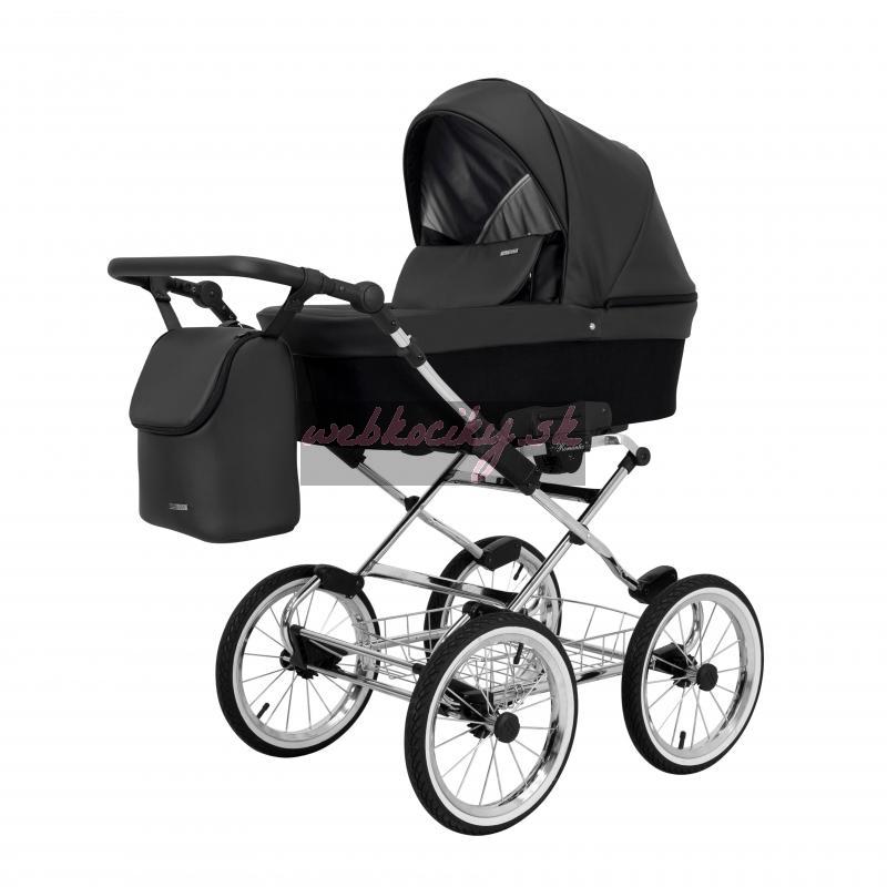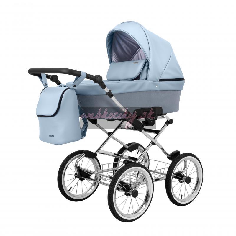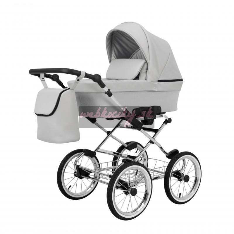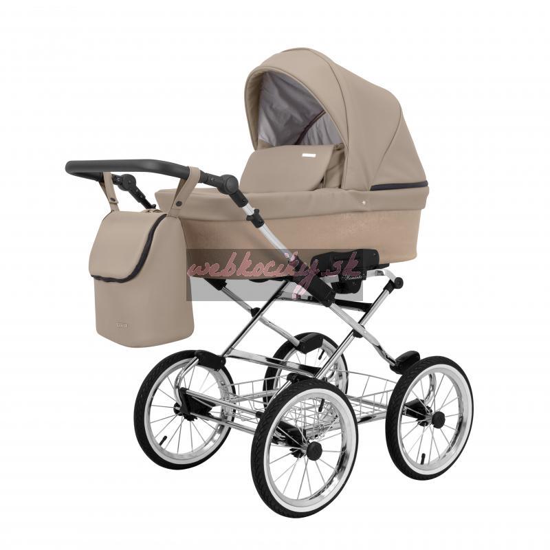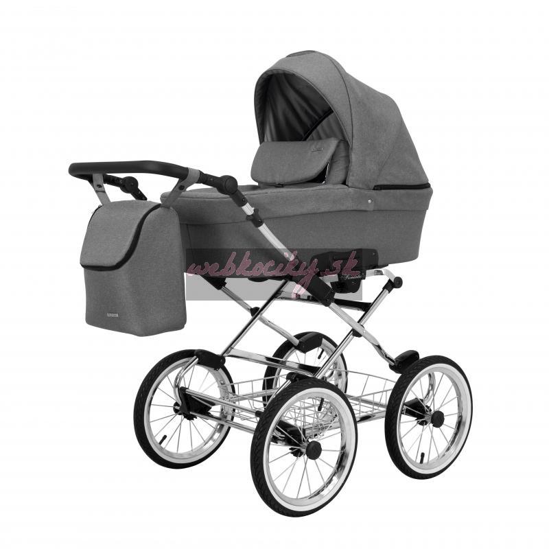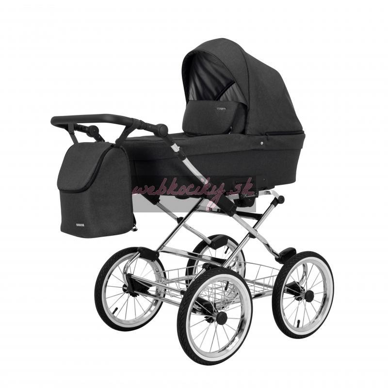 - pochromovaný podvozok kočíka s nafukovacími plne ložiskovými 14" kolesami a kovovým nákupným košom,