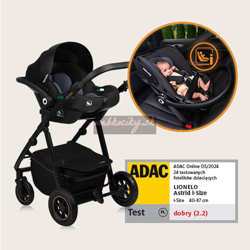 Autosedačka Lionelo Astrid i-Size s ADAC: Súčasťou kočíka je aj detská autosedačka Astrid i-Size s certifikáciou ADAC. Spiace batoľa je možné v autosedačke/nosítku vybrať z auta a autosedačku možno ľahko pripnúť k podvozku kočíka, aby ste sa dostali domov bez nutnosti prebudenia dieťaťa.