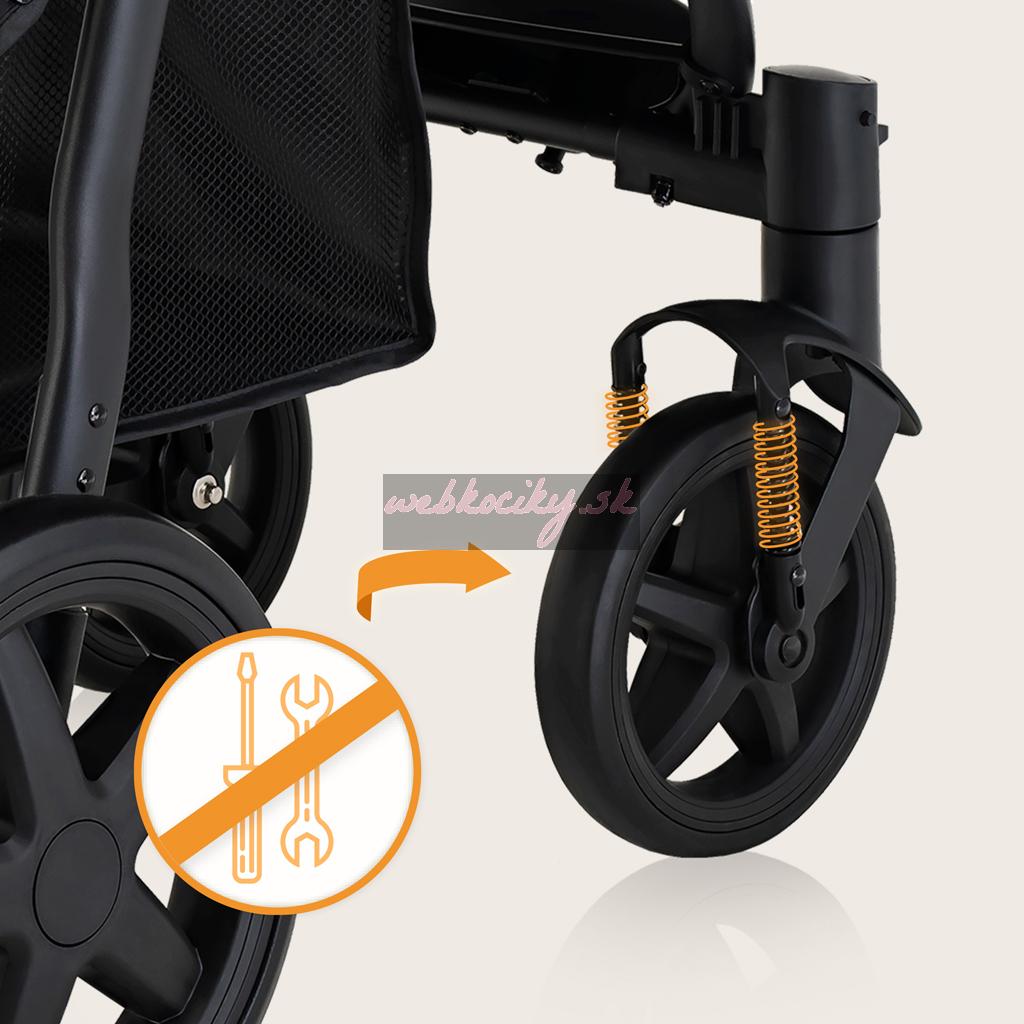 Funkčné kolesá: Veľké, bezúdržbové a pevné kolesá z EVA peny umožňujú pohodlnú jazdu aj na náročnejšom povrchu. Aretácia kolies pre priamu jazdu uľahčuje prekonanie ťažkých terénov. Odpruženie nachádzajúce sa ako v prednej, tak aj zadnej časti kočíka zaručuje pohodlie aj pri jazde po nerovnom povrchu.
