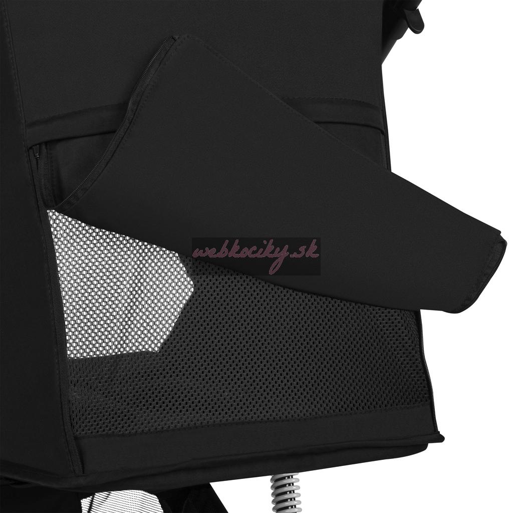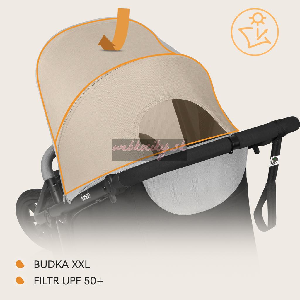 Slnečná strieška XXL: Veľkorysá nepremokavá XXL strieška s prídavným panelom na zips je vybavená filtrom UPF50+ a vodoodpudivou vrstvou chrániacou pred dažďom. Magnetická strieška s priezorom umožňuje mať dieťa neustále na očiach. Súčasťou sady je aj funkčná ochranná fólia proti dažďu.