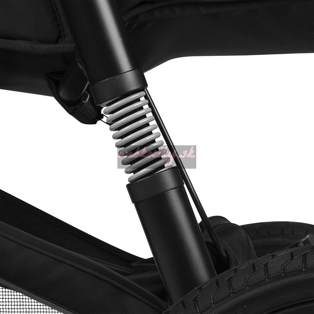 Odpruženie: Kočík je plne odpružený spredu dozadu, takže sa skvele vyrovnáva s prekážkami. Pohodlné polstrovanie rámu kočíka umožňuje slobodnú prechádzku aj v náročnejšom teréne, na pláži alebo pri športe.