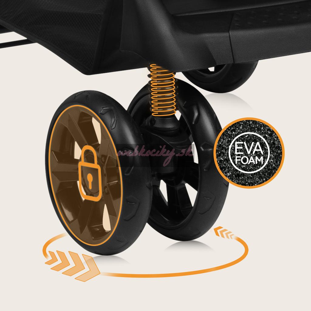Bezúdržbové kolesá: Kolesá s dlhou výdržou z peny EVA sú sú odolné proti prepichnutiu a nie je potrebné ich hustiť. Preto je kočík pripravený na prechádzku, kedykoľvek ho potrebujete! Predné kolesá sú vybavené odpružením nárazov a blokovaním zatáčania, čo uľahčuje hojdanie pri zaspávaní.