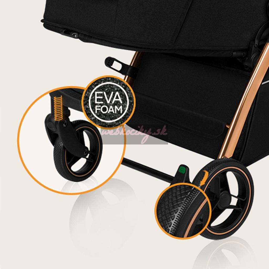 Univerzálne kolesá: Veľké bezúdržbové kolesá z EVA peny sa vyznačujú univerzálnosťou – sú ako ľahké, tak aj odolné. Vďaka možnosti otáčania o 360 ° sú kolesá veľmi dobre ovládateľné a zaisťujú manévrovateľnosť. Dvojité odpruženie umiestnené vpredu aj vzadu zaručuje pohodlie aj pri prekonávaní nerovností. Kočík má centrálnu nožnú brzdu so signalizáciou.