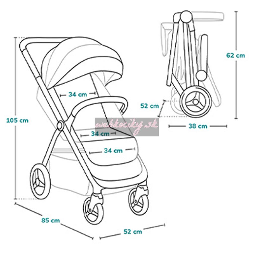 - Rozmery rozloženého kočíka: 85 d x 105 v x 52 š (cm)