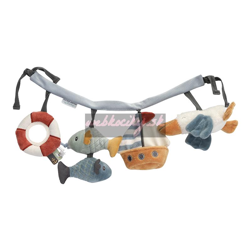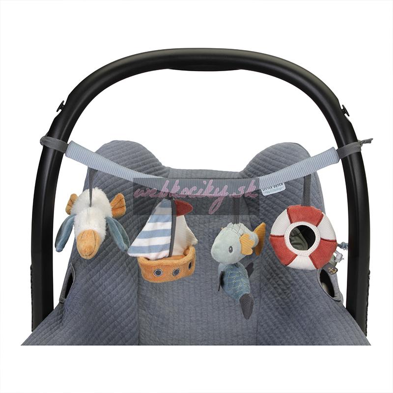 Štyri závesené plyšové hračky v podobe plachetnice, rybičiek, pelikána a záchranného kolesa zabavia vaše bábätko na cestách v autosedačke či kočíku. Jednotlivé hračky pri skúmaní detskými ručičkami hrkajú, po stlačení pískajú a šuštia, pozornosť dieťaťa upúta aj bezpečné zrkadlo. Hračky stimulujú koordináciu ruka/oko dieťaťa.