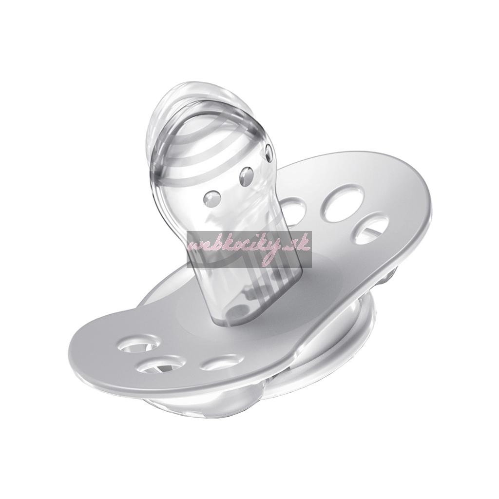 - Tvar silikónovej špičky je prispôsobený prirodzenému saciemu reflexu, silikónová časť je úzka na začiatku pri štítku a rozšírená na konci tak, aby sa špička naťahovala a sťahovala podľa rytmu sania dieťaťa.
