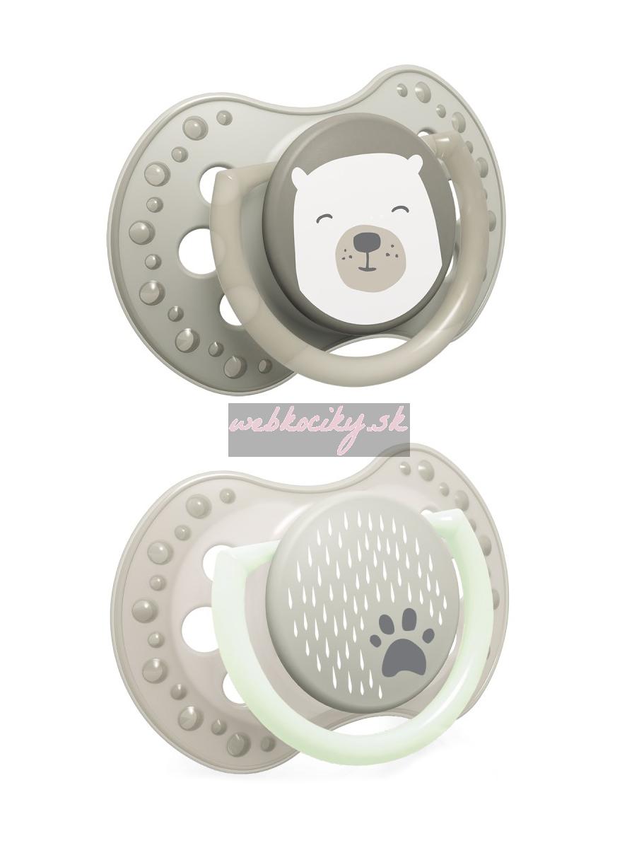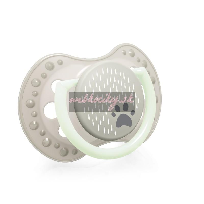 Cumlík so štandardným štítkom, svietiaci disk a bodky uľahčujú nájdenie cumlíka v tme.