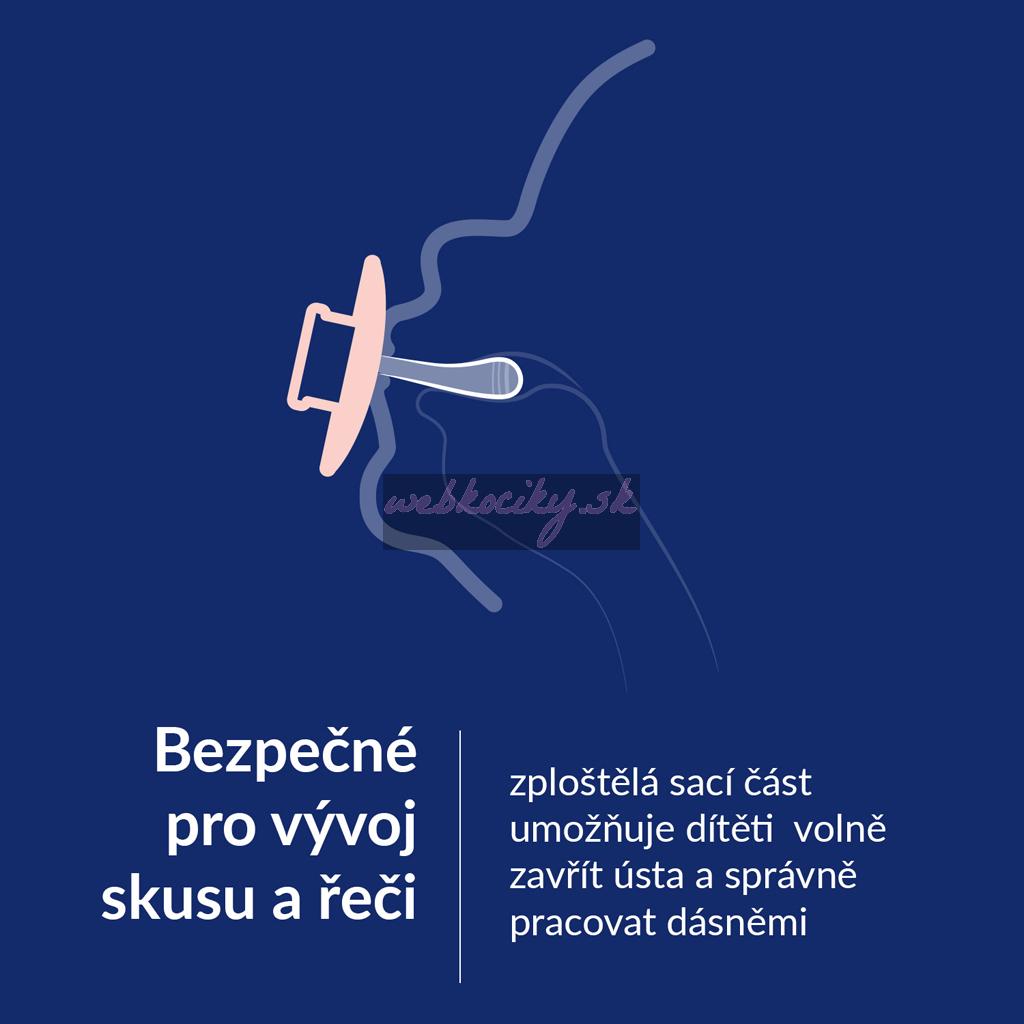 - Dynamický cumlík sa vďaka unikátnej konštrukcii zo silikónu rôznej hrúbky naťahuje a sťahuje podľa rytmu satia dieťaťa. Vďaka tomu chráni jeho sací reflex a nemá nepriaznivý vplyv na dojčenie. Symetrický tvar špičky vychádza z tvaru bradavky naplnenej mliekom, ktorá poskytuje bábätku známy pocit podobný pocitu z prsníka.