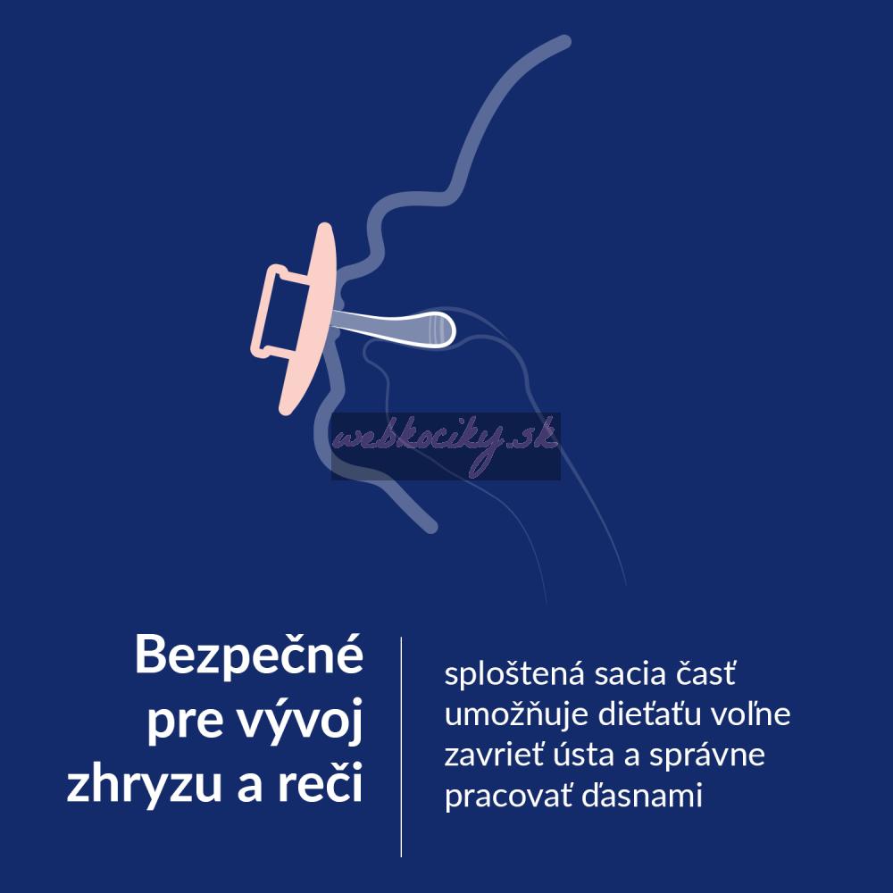 Sploštená sacia časť umožňujú dieťaťu voľne zavrieť ústa a správne pracovať ďasnami.