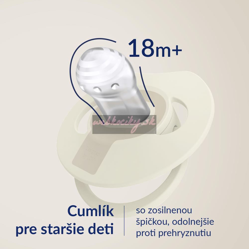 Pred prvým použitím cumlíky varte vo vriacej vode po dobu 5 minút. Potom po vychladnutí vytlačte zvyšnú vodu. Pred každým použitím cumlík umyte teplou vodou. priloženom dezinfekčnom puzdre podľa dodaného návodu. nepoužívajte antibakteriálne alebo abrazívne čistiace prostriedky. Príliš vysoké koncentrácie čistiacich prostriedkov môžu poškodiť cumlík v umývačke riadu. každé 1-2 mesiace. Ak si dieťa vloží celý cumlík do úst, NEPREDAJTE PANICE. Cumlík je navrhnutý tak, aby ho dieťa nemohlo prehltnúť. 3 rokov. Pre bezpečnosť vášho dieťaťa.