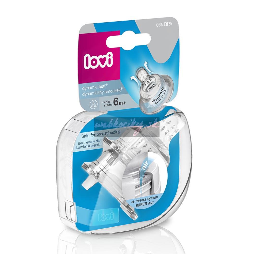 Náhradné cumle na detské fľaše zn. Lovi medium. Dynamický silikónový cumlík Lovi medium vďaka svojmu symetrickému a podobnému tvaru presnej bradavky chráni prirodzený sací reflex dieťaťa a vývin zhryzu a reči. Cumlík má unikátnu konštrukciu z dvoch vrstiev silikónu, vďaka čomu sa prispôsobí satiu dieťaťa v jeho prirodzenom rytme. Cumlík Lovi vyžaduje pri kŕmení aktívne satie, čím zabezpečí bezpečnú možnosť striedavého kŕmenia dieťaťa z fľaše a z prsníka. Dynamický antikolikový cumlík Lovi medium so systémom Super Vent. Vhodné pre deti od 6. mesiaca.