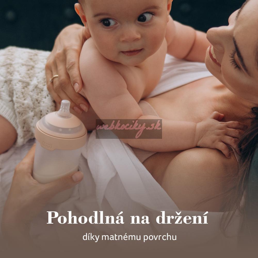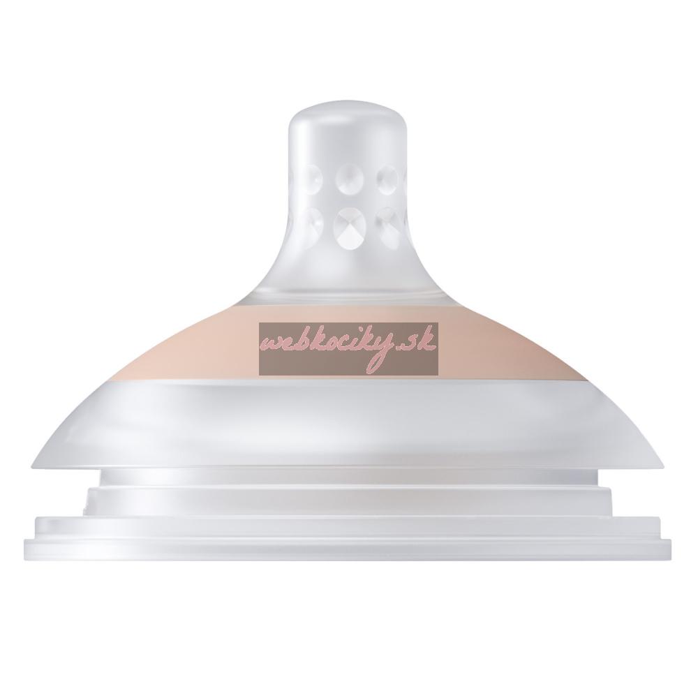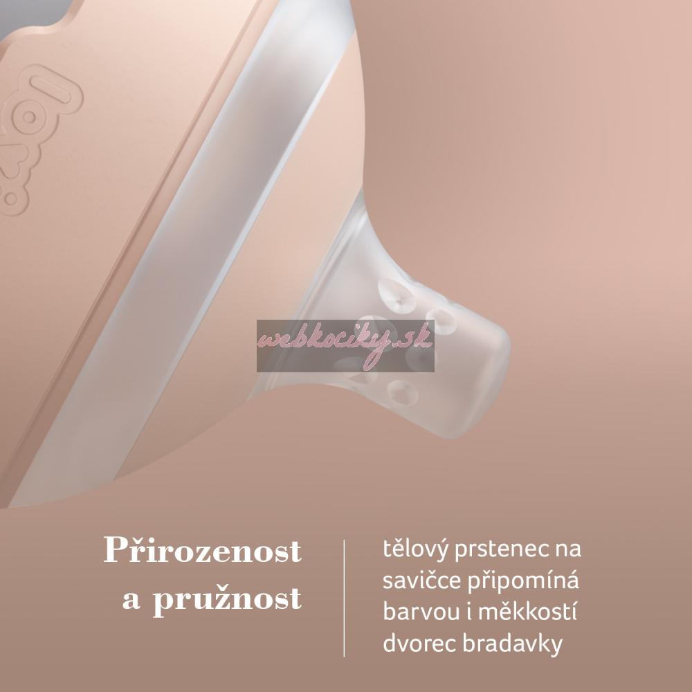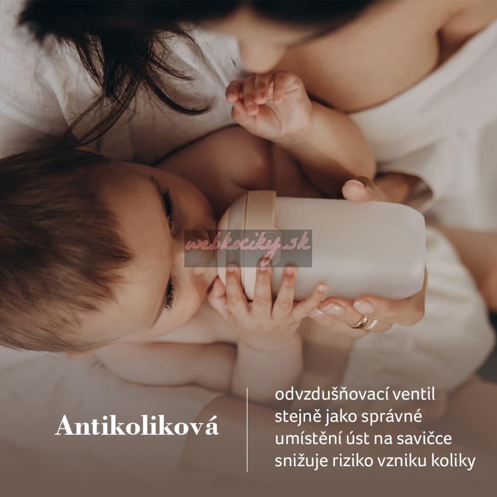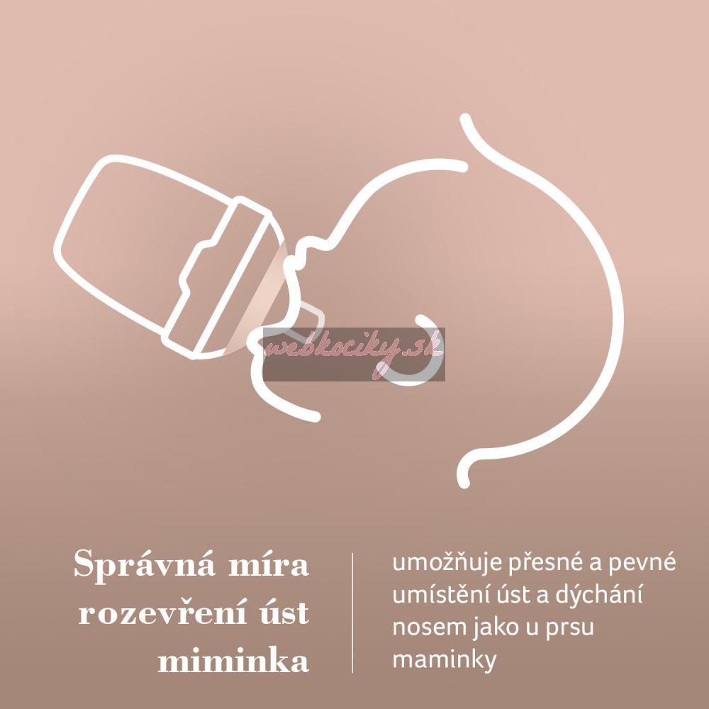 Široký, profilovaný tvar po vzoru maminčiných prsou a dokonalé proporce zajišťují, že ústa dítěte jsou umístěna ve správném úhlu, rty jsou pevně sevřené a dítě může volně dýchat nosem, což snižuje riziko vzniku koliky.
