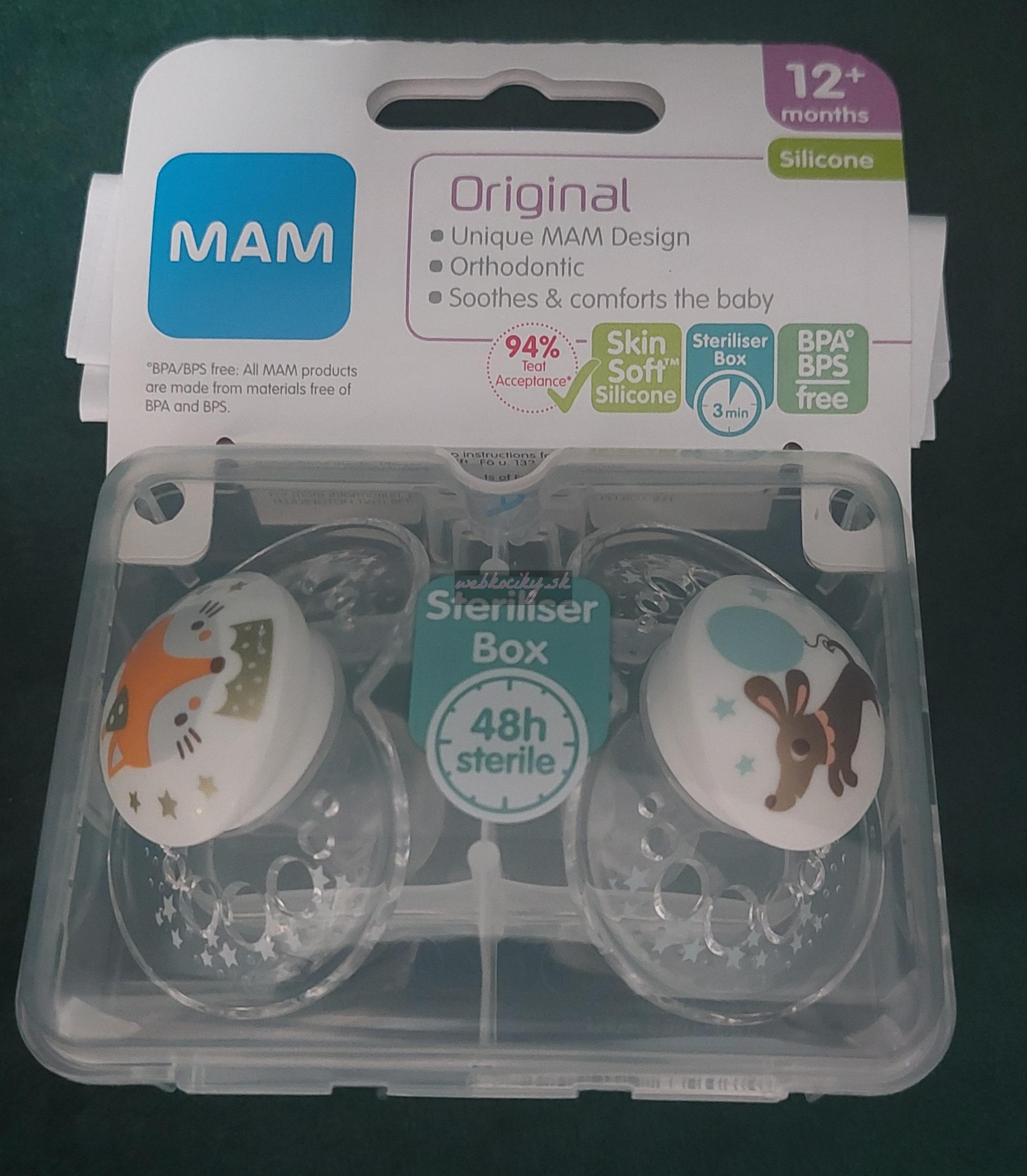 Cumlík Original upokojuje a utešuje dieťatko vďaka ultramäkkému silikónovému cumlíku patentovanému MAM SkinSoftTM, ktorý vďaka jemnému dotyku akceptuje 94 % bábätiek a je podobný pokožke matky*.