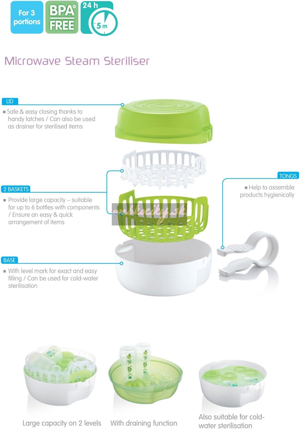 Parný sterilizátor MAM Baby je bezpečná a rýchla dezinfekcia viacerých produktov naraz. Sterilizátor je možné použiť v mikrovlnnej rúre a na sterilizáciu za studena.